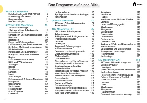 4Das Programm auf einen Blick HOMEAkkus & Ladeger%u00e4te 7Mehrfachladeger%u00e4t XGT BCC01 8R%u00fcckentragbare Akkus 9Stromwandler 11Die Technologien 1240Vmax XGT Maschinen 15Tabless-Technologie 1740Vmax - Akkus & Ladeger%u00e4te 19Bohrschrauber 21Schlagbohr- und Schlagschrauber 23H%u00e4mmer 26Holzs%u00e4gen 29Kapp- und Gehrungss%u00e4gen 32Kantenfr%u00e4se, Oberfr%u00e4se und Hobel 33Schleifer / Multifunktionswerkzeug 34Winkelschleifer 35Metalls%u00e4gen und Lochstanzer 38R%u00fchrger%u00e4t und Betonverdichter 40Nagler 42Kompressore und Polierer 43K%u00fchl- und W%u00e4rmeboxen 44Sonstiges 45Radios 46Ventilatore 47Lampen 48Laser 50Staubsauger 51Kehrsaug- und Scheuer- Maschine 56Blasger%u00e4te 57Rasenm%u00e4her 59Vertikutierer 60Freischneider 61CombiExpress 63Erdbohrer 66Heckenscheren 67Spr%u00fchger%u00e4t und Hochdruckreiniger 68Kettens%u00e4gen 6964Vmax Maschinen 7264Vmax - Akkus & Ladeger%u00e4te 73Rasenm%u00e4her 7418V Maschinen LXT 7518V - Akkus & Ladeger%u00e4te 76Bohrschrauber 78Schlagbohr- und Schlagschrauber 81Trockenbauschrauber 82H%u00e4mmer 87Holzs%u00e4gen 90Kapp- und Gehrungss%u00e4gen 95Fr%u00e4sen und Hobel 97Exzenter- und Schwingschleifer 99Multifunktionswerkzeuge 100Winkelschleifer 101Geradeschleifer 104Blechscheren und Nager/Knabber 105Metalls%u00e4gen und Lochstanzer 106Gewindestangenschneider 107Kabelschneider 108Verschiedenes f%u00fcr Metall-Arbeiten 109Maschinen f%u00fcr Betoneisen 110Betonverdichter und R%u00fchrger%u00e4t 111Trennschleifer 112Kartuschenpistole 113Tacker und Nagler 114Trockenbaus%u00e4gen 116Polierschleifer / Heissluftgebl%u00e4se 117Kompressore und Vakuumpumpen 119K%u00fchl- und W%u00e4rmeboxen 120Sonstiges 121Ventilatore 122Radios 123Heizbare Jacke, Pullover, Decke 124Lampen 126Laser und Ortungsger%u00e4t 130Staubsauger 131Blasger%u00e4te 136Schubkarren 138Rasenm%u00e4her 139Vertikutierer 141Freischneider 142CombiExpress 144Erdbohrer / Reb- und Baumscheren 147Heckenscheren 148Spr%u00fchger%u00e4te und Druckreiniger 150Asts%u00e4ge und Kettens%u00e4ge 151Hochentaster 152Kettens%u00e4gen 15312V Maschinen CXT 15412Vmax - Akkus & Ladeger%u00e4te 155Schlagschrauber 156Holzs%u00e4gen 158Gewindestangentrenner /Schneider 159Kartuschenpistole 159Polierschleifer / Trockenbaus%u00e4ge 160Schere, Kompressor,Ventilator 161Heizbare Jacke 162Lampen 163Laser 164Staubsauger 167Blasger%u00e4te 167Rasentrimmer 168Reb- und Baumschere, Asts%u00e4ge 169