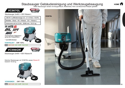 HOME55VC007GLVC007GLZ01*VC006GMVC006GMZ01Ah Ah 2.0 / 2.5 / 4.0 / 4.0F / 5.0 / 8.0 Ah Ah 2.0 / 2.5 / 4.0 / 4.0F / 5.0 / 8.0 VC007GLStaubsauger 2x40V = 80V Klasse L 350 W / Luftf%u00f6rdermenge 2.0 - 3.7 m3/min / 18 kPaBeh%u00e4lter : Staub : 40 l / Wasser : 30 l / Klasse L Autonomie mit 2x 5.0 Ah : 25/80 min / 18.51 kgAutomatische Selbstreini- gung des DoppelfiltersStaubsauger 2x40V = 80V Klasse MGleicher Staubsauger wir VC007GL ausser Klasse MGewicht 18.53 kg* mit AWS-Einheit Staubsauger Geb%u00e4udereinigung und WerkzeugabsaugungDiese Staubsauger werden mit Saugschlauch, Bodend%u00fcse, Rohr und Maschinen-Adapter geliefert.CHF 1'275.-CHF 1'339.-