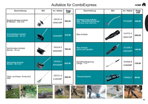 HOME65Beschreibung Bild Art. Makita PreisCHFWasserpumpe Aufsatz Max. Wasserf%u00f6rdermenge : 135 l/min (mit UX01G)PF400MP 349.00Blas-Aufsatz 191P72-3UB401MP289.00Blas-Aufsatz leicht und handlich1912R8-4UB402MP149.00Schaftverl%u00e4ngerungL%u00e4nge : 1 m 191E24-8LE400MP139.00Transporttasche 195638-5 89.00Beschreibung Bild Art. Makita PreisCHFBodenkultivator-Aufsatz%u00d8 Messer : 232 mm 199181-6KR401MP355.00Schneefr%u00e4ser Aufsatz Arbeitsbreite : 30 cm SN400MP 315.00Kehrb%u00fcrsten-AufsatzB%u00fcrste : 25 cm 199318-5BR400MP789.00Kehrwalze-Aufsatz B%u00fcrste : 26.5 cm199339-7SW400MP823.00Obst- und Nuss- Ernte-Auf- satz 195721-8EJ400MP299.00Aufs%u00e4tze f%u00fcr CombiExpress