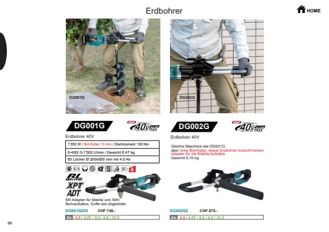 HOME66DG001GZ05 DG002GZDG001G DG002GDG002GAh Ah 4.0 / 4.0F / 5.0 / 8.0 / 33.5 Ah Ah 4.0 / 4.0F / 5.0 / 8.0 / 33.5DG001G1%u2019350 W / Bohrfutter 13 mm / Drehmoment 136 Nm0-400/ 0-1%u2019500 U/min / Gewicht 6.47 kg65 L%u00f6cher %u00d8 200x600 mm mit 4.0 AhErdbohrer 40VMit Adapter f%u00fcr Makita und Stihl Bohraufs%u00e4tze, Griffe wie abgebildetErdbohrer 40VErdbohrerGleiche Maschine wie DG001Gaber ohne Bohrfutter, dieser Erdbohrer braucht keinen Adapter f%u00fcr die Makita-Aufs%u00e4tzeGewicht 6.10 kgCHF 749.- CHF 675.-