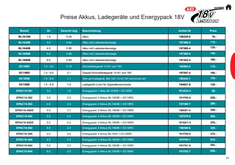 77HOMEModell Ah Gewicht (kg) Beschreibung Artikel-Nr PreisBL1815N 1.5 0.50 Akku 196235-0BL1830B 3.0 0.62 Akku mit Ladestandanzeige 197599-5BL1840B 4.0 0.80 Akku mit Ladestandanzeige 197265-4BL1850B 5.0 0.80 Akku mit Ladestandanzeige 197280-8BL1860B 6.0 0.80 Akku mit Ladestandanzeige 197422-4DC18RC 1.5 - 6.0 0.75 Schnellladeger%u00e4t 14.4V und 18V 195584-2DC18RD 1.5 - 6.0 2.1 Doppel-Schnellladeger%u00e4t 14.4V und 18V 197047-4DC18RE 1.5 - 6.0 1.1 Twin-port ladeger%u00e4t, l%u00e4dt 12V, 14.4V,18V auf einmal auf 198444-7DC18SE 1.5 - 6.0 1.0 Ladeger%u00e4t Li-Ion f%u00fcr Zigarettenanz%u00fcnder 194621-9EPAC18-301 3.0 1.8 Energypack 1 Akku BL1830B + DC18RC 191A24-4EPAC18-302 3.0 2.0 Energypack 2 Akkus BL1830B + DC18RC 191F88-8EPAC18-402 4.0 2.4 Energypack 2 Akkus BL1840B + DC18RC 197490-7EPAC18-402D 4.0 3.7 Energypack 2 Akkus BL1850B + DC18RD 199481-4EPAC18-502 5.0 2.4 Energypack 2 Akkus BL1850B + DC18RC 197570-9EPAC18-502D 5.0 4.2 Energypack 2 Akkus BL1850B + DC18RD 1910A7-5EPAC18-602 6.0 2.4 Energypack 2 Akkus BL1860B + DC18RC 199480-6EPAC18-304 3.0 4.6 Energypack 4 accus BL1830 + DC18RD 191F89-6EPAC18-404 4.0 5.3 Energypack 4 Akkus BL1840B + DC18RD 191F90-1EPAC18-504 5.0 5.3 Energypack 4 Akkus BL1850B + DC18RD 191F91-9EPAC18-604 6.0 5.3 Energypack 4 Akkus BL1860B + DC18RD 191F92-7Preise Akkus, Ladeger%u00e4te und Energypack 18V79.-115.- 135.- 145.- 165.- 115.-165.- 129.-129.- 99.- 229.- 269.-339.-289.-379.- 329.- 479.- 519.- 585.- 639.-