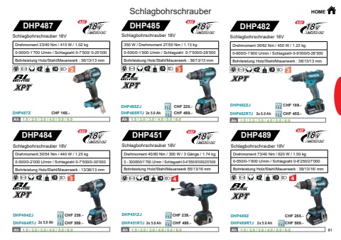 81DHP489DHP489ZDHP489RTJ 2x 5.0 AhAh Ah 1.5 / 2.0 / 3.0 / 4.0 / 5.0 / 6.0 DHP451DHP482RTJDHP482DHP482ZJ2x 5.0 AhDHP451ZJDHP451RTJ 2x 5.0 AhDHP484DHP484ZJDHP484RTJ 2x 5.0 AhDHP485DHP485ZJDHP485RTJ 2x 5.0 AhDHP487DHP487ZAh Ah 1.5 / 2.0 / 3.0 / 4.0 / 5.0 / 6.0 Ah Ah 1.5 / 2.0 / 3.0 / 4.0 / 5.0 / 6.0 Ah Ah 1.5 / 2.0 / 3.0 / 4.0 / 5.0 / 6.0 Ah Ah 1.5 / 2.0 / 3.0 / 4.0 / 5.0 / 6.0 Ah Ah 1.5 / 2.0 / 3.0 / 4.0 / 5.0 / 6.0 HOMESchlagbohrschrauber 18VDrehmoment 73/40 Nm / 620 W / 1.50 kg0-550/0-1%u2019800 U/min / Schlagzahl 0-8%u2019250/27%u2019000Bohrleistung Holz/Stahl/Mauerwerk : 38/13/16/ mmSchlagbohrschrauberSchlagbohrschrauber 18V Schlagbohrschrauber 18VDrehmoment 23/40 Nm / 410 W / 1.02 kg0-500/0-1%u2019700 U/min / Schlagzahl 0-7%u2019500/ 0-25%u2019500Bohrleistung Holz/Stahl/Mauerwerk : 36/13/13 mm 350 W / Drehmoment 27/50 Nm / 1.13 kg0-500/0-1%u2019900 U/min / Schlagzahl 0-7%u2019500/0-28%u2019500 Bohrleistung Holz/Stahl/Mauerwerk : 38/13/13 mm Schlagbohrschrauber 18VSchlagbohrschrauber 18V Schlagbohrschrauber 18VDrehmoment 36/62 Nm / 450 W / 1.23 kg0-600/0-1%u2019900 U/min / Schlagzahl 0-9%u2019000/0-28%u2019500Bohrleistung Holz/Stahl/Mauerwerk : 38/13/13 mm Drehmoment 30/54 Nm / 440 W / 1.25 kg0-500/0-2%u2019000 U/min / Schlagzahl 0-7%u2019500/0-30%u2019000Bohrleistung Holz/Stahl/Mauerwerk : 13/38/13 mmDrehmoment 40/80 Nm / 300 W / 3 G%u00e4nge / 1.74 kg0 - 300/600/1%u2019700 U/min / Schlagzahl 0-4%u2019550/9%u2019000/25%u2019500Bohrleistung Holz/Stahl/Mauerwerk 65/13/16 mm Schlagbohr- und SchlagschrauberCHF 589.-CHF 255.-CHF 489.-CHF 225.-CHF 165.- CHF 455.-CHF 189.-CHF 509.-CHF 239.-CHF 499.-CHF 239.-
