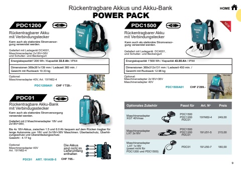 9POWER PACKPDC01 ART. 191A59-5PDC1200A01 PDC1200 PDC1500A01PDC1200 PDC1500PDC1500PDC01>>>>R%u00fcckentragbare Akkus und Akku-Bank HOMER%u00fcckentragbare AkkusOptional:Maschinenadapter 40V, Art. 191N62-4Bis 4x 18V-Akkus, zwischen 1.5 und 6.0 Ah bequem auf dem R%u00fccken tragbar f%u00fcr lange Autonomie von 18V und 2x18V=36V Maschinen. %u00dcberlastschutz, %u00dcberhitzungsschutz und %u00dcberentladungsschutz.Gewicht : 4.17 kgKann auch als station%u00e4re Stromversorgung verwendet werden.Geliefert mit 2 Maschinenadapter 18V und 2x18V=36V,Geliefert mit Ladeger%u00e4t DC4001, Maschinenadapter 2x18V=36V und Schulter- und BeckengurtEnergiekapazit%u00e4t1%u2019206 Wh / Kapazit%u00e4t 33.5 Ah / IPX4Dimensionen 369x261x139 mm / Ladezeit 360 min. / Gewicht mit Rucksack 10.33 kg Kann auch als station%u00e4re Stromversor- gung verwendet werden.R%u00fcckentragbarer Akku mit VerbindungsteckerR%u00fcckentragbarer Akku mit VerbindungsteckerGeliefert mit Ladeger%u00e4t DC4001, und Schulter- und BeckengurtEnergiekapazit%u00e4t 1%u2019568 Wh / Kapazit%u00e4t 43.55 Ah / IPX4Dimensionen 369x312x131 mm / Ladezeit 450 min. / Gewicht mit Rucksack 12.96 kgKann auch als station%u00e4re Stromversor- gung verwendet werden.Optional:Maschinenadapter 2x18V=36VMaschinenadapter 40VR%u00fcckentragbare Akku-Bank mit VerbindugssteckerOptionalMaschinenadapter 40V Art. 191N62-4Die Akkus sind nicht im Lieferumfang enthaltenOptionales Zubeh%u00f6r Passt f%u00fcr Art. No PreisMaschinenadapterXGT 40VmaxPDC1500PDC1200PDC01191N62-4 249,00Maschinenadapter LXT 2x18VPDC1500PDC1200PDC01191J51-5 215,00Maschinenadapter LXT 1x18V(passt nicht f%u00fcrPDC1200 und PDC1500)PDC01 191J50-7 180,00CHF 1%u2019729.- CHF 2%u2019299.-CHF 705.-