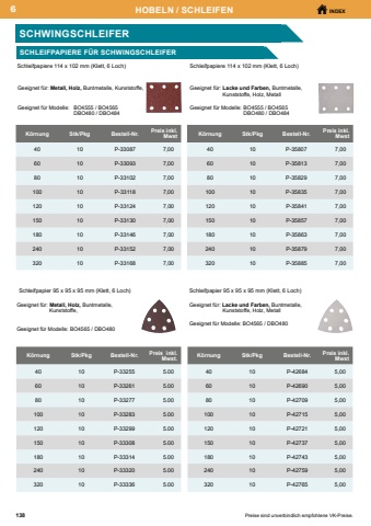 3 42BOHRENINDEXPreise sind unverbindlich empfohlene VK-Preise.HOLZBOHRERSCHLANGENBOHRER MIT SECHSKANTSCHAFTSCHLANGENBOHRERBohrer %u00d8 (mm)Gesamtl%u00e4nge (mm)Arbeitsl%u00e4nge (mm)Bestell-Nr.Preis inkl. Mwst6,0200130D-072384,006,0250180D-073314,008,0200130D-072445,008,0250180D-073475,008,0400330D-0743410,008,0450380D-0755912,0010,0200130D-072506,0010,0250180D-073536,0010,0400330D-0744010,0010,0450380D-0756513,0012,0200130D-072666,0012,0250180D-073696,0012,0400330D-0745612,0012,0450380D-0757115,0014,0200130D-072727,0014,0250180D-073758,0014,0400330D-0746213,0014,0450380D-0758715,0016,0200130D-072888,0016,0250180D-073818,0016,0400330D-0747815,0016,0450380D-0759320,00Bohrer %u00d8 (mm)Gesamtl%u00e4nge (mm)Arbeitsl%u00e4nge (mm)Bestell-Nr.Preis inkl. Mwst18,0200130D-072948,0018,0250180D-0739710,0018,0400330D-0748417,0018,0450380D-0760221,0020,0200130D-073039,0020,0250180D-0740610,0020,0400330D-0749019,0020,0450380D-0761823,0022,0200130D-0731911,0022,0250180D-0741212,0022,0400330D-0750922,0022,0450380D-0762425,0024,0200130D-0732511,0024,0250180D-0742813,0024,0400330D-0751526,0024,0450380D-0763029,0026,0400330D-0752129,0026,0450380D-0764630,0028,0400330D-0753735,0028,0450380D-0765235,0030,0400330D-0754338,0030,0450380D-0766842,00Der Schlangenbohrer ist besonders geeignet f%u00fcr tiefe Bohrl%u00f6cher und erzielt aufgrund der speziellen Geometrie ein sehr sauberes und schnelles Bohrergebnis.Bestens geeignet f%u00fcr Hart-, Weich-, Leim-, Massiv-, Stirnh%u00f6lzer und Balken.Spiralbohrer mit Zentrierspitze und 2 Schulterschneiden f%u00fcr exakte und splitterfreie Bohrungen in Hart- und Weichholz.SPIRALBOHRER MIT 1/4\Bohrer %u00d8 (mm)Gesamtl%u00e4nge (mm)Bestell-Nr.Preis inkl. Mwst3,075D-158613,004,090D-158773,005,0100D-158833,006,0110D-158994,00Bohrer %u00d8 (mm)Gesamtl%u00e4nge (mm)Bestell-Nr.Preis inkl. Mwst8,0115D-159084,0010,0130D-159144,0012,0150D-159204,0015,0160D-159365,00