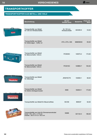 INDEX2 1 - Akkus / Ladeger%u00e4te4 R%u00fcckentragbare Akkus6Energypacks8Akkus Li-Ion CXT, LXT und XGT10Ladeger%u00e4te Li-Ion12Ladezeit Tabelle14Stromwandler15Adapter16Verschiedenes17Jacken, Pullover und Decke18 2 - Schrauben19 Impact Premier - Bits21Impact Premier - Verschiedenes23Torsion Bits24Spezifische Bits25Verschiedenes Zubeh%u00f6r25Bithalter27Bitsets28Werkzeugset31Bitsets 1/4\32Magazinschrauber33Schlagschrauber34Schlagn%u00fcsse34Schlagnuss-Sets37Steckschl%u00fcssel38Verschiedenes40 3 - Bohren41 Holzbohrer42Metallbohrer44Diamantbohrer46Kegelsenker47Stein / Betonbohrer48Universal-Bohrer 48Bohrer Sets49Bohrer und Bit Sets52Lochs%u00e4gen Ezychange56Magnetbohrmaschine60Seitengriffe61Verschiedenes62 4 - H%u00e4mmer63 Meissel -Aufnahmen und -Arten64Geeignet f%u00fcr SDS-PLUS65NEMESIS II Hammerbohrer65Meissel67Bohrkronen Innenkonus 1:868SDS-PLUS Bohrersets69Bohrfutter und Adapter72Geeignet f%u00fcr SDS-MAX734-Schneiden bohrer NEMESIS74Adapter f%u00fcr SDS-MAX Bohrhammer75Meissel und Zubeh%u00f6r76BohrkronenSDS-MAX (Konus 1:8)77Sets SDS-MAX78Makita Sechskantaufnahme79Sonstiges Zubeh%u00f6r81Service Kits83 5 - S%u00e4gen88 Hartmetall Kreiss%u00e4gebl%u00e4tter89Stichs%u00e4gebl%u00e4tter102S%u00e4bels%u00e4gebl%u00e4tter107S%u00e4bels%u00e4gebl%u00e4tter Sets111Stichs%u00e4gen und S%u00e4bels%u00e4gen112Handkreiss%u00e4gen113F%u00fchrungsschienen114Tisch- / Gehrungss%u00e4gen116Untergestelle120Bands%u00e4gen und Akku-Bands%u00e4gen121Bands%u00e4gebl%u00e4tter122Kettenstemmer 7104L123Gipskartons%u00e4gen123 6 - Hobeln / Schleifen124 Hobelmesser125Hobel - Verschiedenes Zubeh%u00f6r125Station%u00e4rhobel 2012NB127Netzschleifmittel128Erkl%u00e4rung zum Schleifpapier129Bandschleifer130Exzenterschleifer132Langhalsschleifer 134Polier- und B%u00fcrstmaschinen135Schleif- und Polierteller136Polierhauben und Schw%u00e4mme137Schwingschleifer138Bandfeilen142B%u00fcrsten144 7 - Fr%u00e4sen / Multitool145 HM-Fr%u00e4ser146HM-Fr%u00e4ser Sets152Fr%u00e4sen154Nutfr%u00e4sen158Trockenbaufr%u00e4sen 159Plattenfr%u00e4se159Multifunktionsw. Starlock161Verschiedenes166Multifunktionsw. Starlock Max167 8 - Metallbearbeitung169 S%u00e4gebl%u00e4tter f%u00fcr Metall170Trenn- und Schruppscheiben172X-LOCK System173Fiberscheiben \175F%u00e4cher- und Reinigungsscheiben176Stahldrahtb%u00fcrsten178Winkelschleifer179Handtrennschleifer183Geradeschleifer184Schleifb%u00f6cke186Blechscheren187Knabber187Lochstanze188Crimpzangen189Blindnietsetzger%u00e4te 192Gewindestangentrenner192 9 - Diamant 193 Material Infos195Diamanttrennscheiben196Diamantschneider - Verschiedenes200Diamant-Fliesenbohrkronen200Diamant-Topfscheiben201 10 - Diverse Arbeiten202 Scheren203Tacker204Nagler204Kartuschenpressen 205Fettpresse206Vakuumpumpen206Maschinen f%u00fcr Armierungseisen207Betonverdichter208R%u00fchrger%u00e4te209Kompressore211