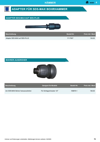 227INDEXIrrt%u00fcmer und %u00c4nderungen vorbehalten. Abbildungen k%u00f6nnen variieren. 04/2025. SCHRAUBENBeschreibungGr%u00f6sse (mm)Bestell-Nr.Preis inkl. MwstBithalter Click-Fix magnetischf%u00fcr ProfisExtra stark60P-5326327,00Bithalter mit Schnellwechselfunktion %u2013 schlanke Ausf%u00fchrungmit Verriegelung60B-524676,00Bithalter mit Dauermagnet60B-524455,00Bithalter mit Magnetring zur Schraubenstabilisierung80B-487515,00120B-487676,00Bithalter mit Magnetring zur Schraubenstabilisierunginklusiv Bit-Set L=25 mmje 5 Stk PH2, PZ2, T20, T25, T3080B-48773*21,00120B-48789**23,00Bithalter mit flexibler Welle mit 2 Eins%u00e4tzenPH2 + Schlitz Nr 6L = 300B-5186754,00Bithalter lang magnetischL = 150B-577509,00L = 300B-5776612,00Ratschenschraubendreher(Bithalter) mit PH2D-5883312,00* Inklusiv Art. B-48751 L=80 mmBITHALTER** Inklusiv Art. B-48767 L=120 mm