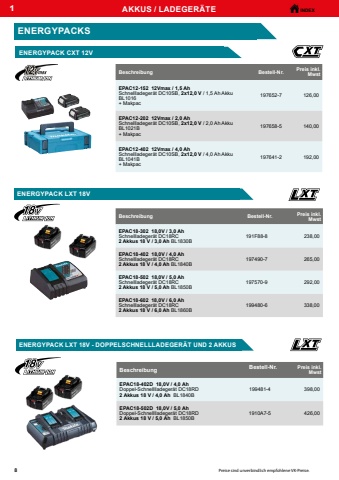 1 8AKKUS / LADEGER%u00c4TEINDEXPreise sind unverbindlich empfohlene VK-Preise.BeschreibungBestell-Nr.Preis inkl. MwstEPAC12-152 12Vmax / 1,5 AhSchnellladeger%u00e4t DC10SB, 2x12,0 V / 1,5 Ah Akku BL1016 + Makpac197652-7126,00EPAC12-202 12Vmax / 2,0 AhSchnellladeger%u00e4t DC10SB, 2x12,0 V / 2,0 Ah Akku BL1021B+ Makpac197658-5140,00EPAC12-402 12Vmax / 4,0 Ah Schnellladeger%u00e4t DC10SB, 2x12,0 V / 4,0 Ah Akku BL1041B + Makpac197641-2192,00ENERGYPACK CXT 12VENERGYPACKSBeschreibungBestell-Nr.Preis inkl. MwstEPAC18-302 18,0V / 3,0 Ah Schnellladeger%u00e4t DC18RC2 Akkus 18 V / 3,0 Ah BL1830B 191F88-8238,00EPAC18-402 18,0V / 4,0 AhSchnellladeger%u00e4t DC18RC2 Akkus 18 V / 4,0 Ah BL1840B 197490-7265,00EPAC18-502 18,0V / 5,0 Ah Schnellladeger%u00e4t DC18RC2 Akkus 18 V / 5,0 Ah BL1850B 197570-9292,00EPAC18-602 18,0V / 6,0 Ah Schnellladeger%u00e4t DC18RC2 Akkus 18 V / 6,0 Ah BL1860B 199480-6338,00BeschreibungBestell-Nr.Preis inkl. MwstEPAC18-402D 18,0V / 4,0 Ah Doppel-Schnelllladeger%u00e4t DC18RD2 Akkus 18 V / 4,0 Ah BL1840B199481-4398,00EPAC18-502D 18,0V / 5,0 Ah Doppel-Schnelllladeger%u00e4t DC18RD2 Akkus 18 V / 5,0 Ah BL1850B 1910A7-5426,00ENERGYPACK LXT 18VENERGYPACK LXT 18V - DOPPELSCHNELLLADEGER%u00c4T UND 2 AKKUS