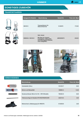 233INDEXIrrt%u00fcmer und %u00c4nderungen vorbehalten. Abbildungen k%u00f6nnen variieren. 04/2025. SCHRAUBENMAGAZINSCHRAUBERLANGE SCHRAUBERBITSPHILLIPS KREUZSCHLITZ-SCHRAUBERBITS PH2KREUZSCHLITZ-SCHRAUBERBITS PZ2L%u00e4nge (mm)Stk/PkgGeeignet f%u00fcr ModelleBestell-Nr.Preis inkl. Mwst110106830 / 6831DP-1355263,00127106832P-1356875,001555DFR551/ DFR552191V02-064,0015736842/DFR540/BFR550/DFR550P-6779529,001305DFS451 / DFS452 / DFS250 / DFS251FS6300 / FS6200 / FS4300 / FS4200 / FS2300mit Adapter f%u00fcr gegurtete SchraubenArt. 191L24-0 (siehe unten)199155-767,00L%u00e4nge (mm)Stk/PkgGeeignet f%u00fcr ModelleBestell-Nr.Preis inkl. Mwst127106832P-1358097,00ADAPTER F%u00dcR GEGURTETE SCHRAUBENGeeignet f%u00fcr ModelleBestell-Nr.Preis inkl. MwstDFS451 / DFS452 / DFS250 / DFS251FS6300 / FS6200 / FS4300 / FS4200 / FS2300191L24-0107,00Mit diesem Adapter kann man einen Schrauber wie ein Magazinschrauber brauchen.Geeignet f%u00fcr Schrauben von 25 bis 55 mm.Das Schrauberbit 199155-7 (siehe oben) ist f%u00fcr diesen Adapter geeignet.GRIFFVERL%u00c4NGERUNGGeeignet f%u00fcr ModelleBestell-Nr.Preis inkl. Mwst.6841 / 6841R / 6842 / 6843 / 6844 / 6845BFR440 / DFR440 / BFR550 / DFR550194500-1*139,00* Verl%u00e4ngerung von 600 bis 700 mm ausziehbar (Gesamtl%u00e4nge inkl. Maschine 890 bis 990 mm)