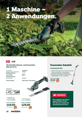 Wir empfehlen den Akkupack Li-Power 2.0 Ah.165 Minuten Laufzeit mit Strauchmesser bei 18 VHINWEIS1 Maschine %u20132 Anwendungen.%u2192metaBOX 145%u2192ohne Akkupack%u2192ohne Ladeger%u00e4tBestell-Nr. 601609840149.00inkl. MwSt/vRG18-Volt-Akku-Strauch- und GrasschereSGS 18 LTX QSchnittzahl2.300/mmGewicht (ohne Akkupack)0,8 kgMit StrauchmesserSchnittl%u00e4nge20 cmSchnittst%u00e4rke8 cmMit StrauchmesserSchnittbreite11,5 cmService GruppeH02=135.00 / FS3=159.00Lieferumfang%u2192ohne Akkupack%u2192ohne Ladeger%u00e4tBestell-Nr. 601609850129.00inkl. MwSt/vRG%u2192Stabiler Teleskopstab f%u00fcr r%u00fcckenschonendes, exaktes Schneiden von Rasenkanten%u2192Einfaches Anbringen ohne Werkzeug%u2192Gesamtl%u00e4nge variabel von 90 bis 102 cm%u2192Arbeitswinkel um 125%u00b0 verstellbarBestell-Nr. 628426000 65.00inkl. MwStPassendes Zubeh%u00f6rTeleskopstab SGS10