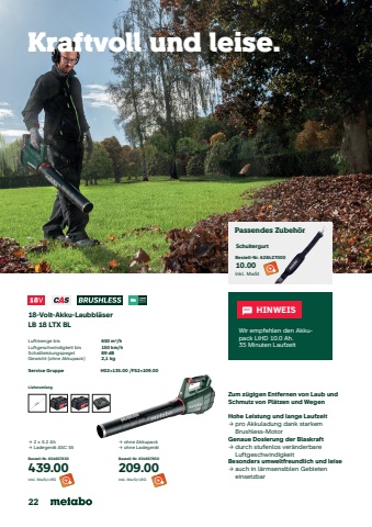 Durchzugsstark f%u00fcr schnelle Schnitte.Hoher Arbeitskomfort%u2192Kompakte Bauform%u2192Geringes Gewicht - 3,2 kg%u2192Gummierter Handgriff f%u00fcr rutschfesten Halt%u2192Einfache Bedienung%u2192Geschwindigkeit stufenlos einstellbar%u2192Hoher Anwenderschutz%u2192Kettenschnellstopp bei R%u00fcckschlag und Loslassen des Schalters%u2192Zus%u00e4tzlicher Sicherheitsschalter am Hauptgriff gegen unbeabsichtigtes Starten%u2192R%u00fcckschlagarme Oregon-Kette%u2192Leise durch Akkubetrieb, dadurch auch in l%u00e4rmsensiblen Bereichen einsetzbarMinimaler Wartungsaufwand%u2192Kein Kohleb%u00fcrstenwechsel%u2192Automatische Kettenschmierung%u2192Einfaches Nachspannen und Wechseln der Kette6