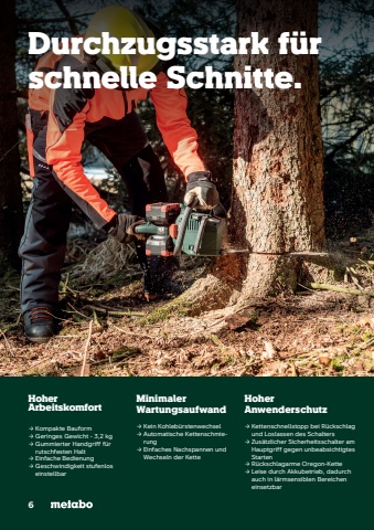 Durchzugsstark f%u00fcr schnelle Schnitte.Hoher Arbeitskomfort%u2192Kompakte Bauform%u2192Geringes Gewicht - 3,2 kg%u2192Gummierter Handgriff f%u00fcr rutschfesten Halt%u2192Einfache Bedienung%u2192Geschwindigkeit stufenlos einstellbar%u2192Hoher Anwenderschutz%u2192Kettenschnellstopp bei R%u00fcckschlag und Loslassen des Schalters%u2192Zus%u00e4tzlicher Sicherheitsschalter am Hauptgriff gegen unbeabsichtigtes Starten%u2192R%u00fcckschlagarme Oregon-Kette%u2192Leise durch Akkubetrieb, dadurch auch in l%u00e4rmsensiblen Bereichen einsetzbarMinimaler Wartungsaufwand%u2192Kein Kohleb%u00fcrstenwechsel%u2192Automatische Kettenschmierung%u2192Einfaches Nachspannen und Wechseln der Kette6
