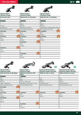 9+ the swiss edition.Schlagschrauber / Visseuse %u00e0 choc Bohrhammer / MarteauWinkelschleifer / Meuleuse d'angleS%u00e4bels%u00e4ge / Scie sabreMultitool / Outil multifonctionsPowerMaxx SSD 12 BLPowerMaxx BH 12 BL 16PowerMaxx CC 12 BLPowerMaxx SSE 12 BLPowerMaxx MT 12140 Nm3,1 J, 5'250 /min%u00d8 76 mm16 mm1/4\16 mm, L-Shape form20'000 /min0 - 3'000 /min7'000 - 18'000 /minH01=69.00/FS2=109.00H02=135.00/FS3=159.00H01=69.00/FS2=109.00H02=135.00/FS3=159.00H01=69.00/FS2=109.006011158906002078506003488506023228906130898500.610.610.610.610.61189.00249.00179.00249.00149.006011155006003485006023225006130895001.581.581.582.33259.00259.00339.00219.00Baustrahler/ Projecteur de chantier Power Adapter / AdapteurBaustellenradio / Radio de chantierBaustellenradio / Radio de chantierStrauch- und Grasschere /Sculpte-haie et cisaille %u00e0 gazonBSA 12-18 LED 2000PowerMaxx PA 12 LED-USBR 12-18 DAB BTRC 12-18 32W BT DAB+ PowerMaxx SGS 12 QDAB+, FM/AM, BluetoothQuick2'000 lm5 V USB + LED-LichtDAB+, FM/AM, Bluetooth Netzkabel / C%u00e2ble secteurmit Akku-Ladefunktion / avec fonction de recharge de la batterie200 mm / 80 mm / 115 mmH01=69.00/FS1=55.00Keine/FS1=55.00H01=69.00/FS1=55.00H02=135.00/FS4=215.00H01=69.00/FS1=55.006015048506002980006007788506007791806016088500.190.200.612.500.61139.0049.00159.00409.00139.006016085002.33199.0012 V