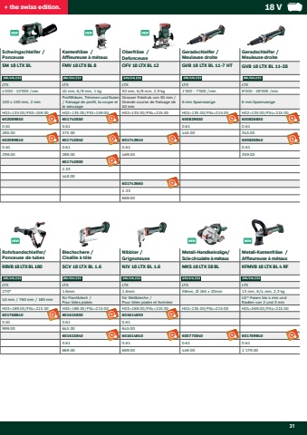 Bohrschrauber / Perceuse-visseuseBohrschrauber / Perceuse-visseuseBohrschrauber / Perceuse-visseuseBS 18 L BL QBS 18 LT BLBS 18 LT BL QLLTLT65 Nm / Quick75 Nm75 Nm / Quick0 - 500 / 0 - 1700 /min0 - 600 / 0 - 2'100 /min0 - 600 / 0 - 2'100 /minH02=135.00/FS2=109.00H02=135.00/FS3=159.00H02=135.00/FS4=215.006131568506023258906023348900.610.610.61205.00215.00245.006131568406023258406023348400.610.610.61219.00229.00259.006131565002.33289.006023255002.33369.006023258006023348002.332.33379.00419.00Bohrschrauber / Perceuse-visseuseBohrschrauber / Perceuse-visseuseBohrschrauber / Perceuse-visseuseBS18LTX-3BL QIBS18LTX-3BLIMetalBS18LTX-3BLQIMetal LTXLTXLTX130 Nm / Quick130 Nm / Metall130 Nm / Quick / Metall0-450 /min / 0-2'000/min /0-4'000/min0-450 /min / 0-2'000/min /0-4'000/min0-450 /min / 0-2'000/min /0-4'000/minH02=135.00/FS4=215.00H02=135.00/FS4=215.00H02=135.00/FS4=215.006031848506031818506031808500.610.610.61345.00365.00395.006031848406031818406031808400.610.610.61359.00389.00419.006031846606031816606031806602.332.332.33579.00639.00699.0015+ the swiss edition.18 V