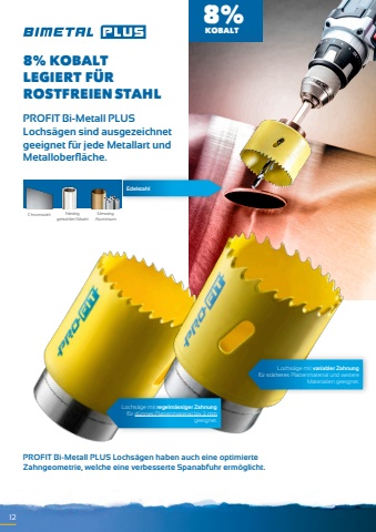 8% KOBALT LEGIERT F%u00dcR ROSTFREIENSTAHLPROFIT Bi-Metall PLUS Lochs%u00e4gen sind ausgezeichnet geeignet f%u00fcr jede Metallart und Metalloberfl%u00e4che.MessingAluminiumNiedrig gekohlterStkahl8%KOBALTChromstahlPROFIT Bi-Metall PLUS Lochs%u00e4gen haben auch eine optimierte Zahngeometrie, welche eine verbesserte Spanabfuhr erm%u00f6glicht.Lochs%u00e4ge mit regelm%u00e4ssiger Zahnungf%u00fcr d%u00fcnnes Plattenmaterial bis 3 mmgeeignet.Lochs%u00e4ge mit variabler Zahnung f%u00fcr st%u00e4rkeres Plattenmaterial und weitere Materialien geeignet.12Edelstahl