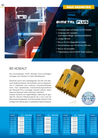 108% KOBALTDie hochwertigen ProFit Bimetal Plus-Lochs%u00e4gen schlagen sich wacker in vielen Metallsorten. Steinhart durch den Kobaltgehalt von 8% und dennoch %u00e4u%u00dferst pr%u00e4zise. Sie entfalten sich ausgezeichnet in Edelstahl und scheuen Industrieumfelder nicht. Das tats%u00e4chliche Unterscheidungsmerkmal der Bimetall Plus Lochs%u00e4ge besteht jedoch darin, dass wir bewusst zwei Varianten anbieten. Unsere Variante mit regelm%u00e4%u00dfiger Zahnung ist speziell f%u00fcr d%u00fcnnes Plattenmaterial bis 3 mm und f%u00fcr Rohrmaterial geeignet. Und die variable Version? Die schl%u00e4gt ihre Z%u00e4hne gern in st%u00e4rkeres Plattenmaterial.DURCHMESSER VARIABLE UND REGELM%u00c4SSIGE ZAHNUNGHochwertige Lochs%u00e4ge mit 8% Kobalt Achtung: Mit variabler und regelm%u00e4%u00dfiger Zahnung erh%u00e4ltlichL%u00e4nge 38 mmBis zu 15 mm S%u00e4getiefe in StahlDurchmesser von 19 mm bis 210 mmBis zu 3x schneller Patentiertes Click & Drill%u00ae Max-SystemVariabel Dm. Regelm%u00e4%u00dfig1904 1019 19 mm 1905 10191904 1020 20 mm 1905 10201904 1021 21 mm 1905 10211904 1022 22 mm 1905 10221904 1024 24 mm 1905 10241904 1025 25 mm 1905 10251904 1027 27 mm 1905 10271904 1029 29 mm 1905 10291904 1030 30 mm 1905 1030Variabel Dm. Regelm%u00e4%u00dfig1904 1032 32 mm 1905 10321904 1033 33 mm 1905 10331904 1035 35 mm 1905 10351904 1037 37 mm 1905 10371904 1038 38 mm 1905 10381904 1040 40 mm 1905 10401904 1041 41 mm 1905 10411904 1043 43 mm 090510431904 1044 44 mm 1905 1044Variabel Dm. Regelm%u00e4%u00dfig1904 1046 46 mm 1905 10461904 1048 48 mm 1905 10481904 1051 51 mm 1905 10511904 1052 52 mm 1905 10521904 1054 54 mm 1905 10541904 1056 56 mm 1905 10561904 1057 57 mm 1905 10571904 1059 59 mm 1905 10591904 1060 60 mm 1905 1060Variabel 1904 1064 1904 1065 1904 1067 1904 1068 1904 1070 1904 1073 1904 1076 1904 1079 1904 1083 NEUE GEOMETRIE