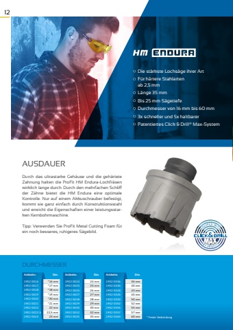 12AUSDAUERDurch das ultrastarke Geh%u00e4use und die geh%u00e4rtete Zahnung halten die ProFit HM Endura-Lochfr%u00e4sen wirklich lange durch. Durch den mehrfachen Schliff der Z%u00e4hne bietet die HM Endura eine optimale Kontrolle. Nur auf einem Akkuschrauber befestigt, kommt sie ganz einfach durch Konstruktionsstahl und erreicht die Eigenschaften einer leistungsstarken Kernbohrmaschine. Tipp: Verwenden Sie ProFit Metal Cutting Foam f%u00fcr ein noch besseres, ruhigeres S%u00e4gebild. Die st%u00e4rkste Lochs%u00e4ge ihrer Art F%u00fcr h%u00e4rtere Stahlarten ab 2,5 mm L%u00e4nge 35 mmBis 25 mm S%u00e4getiefeDurchmesser von 16 mm bis 60 mm3x schneller und 5x haltbarer Patentiertes Click & Drill%u00ae Max-SystemDURCHMESSERArtikelnr. Dm.1902 0016 *16 mm 1902 0017 *17 mm 1902 0018 *18 mm1902 0019 *19 mm1902 0020 *20 mm1902 0021 *21 mm 1902 0022 22 mm1902 0022.5 22,5 mm 1902 0023 23 mm Artikelnr. Dm.1902 0024 24 mm 1902 0025 25 mm 1902 0026 26 mm 1902 0027 27 mm 1902 0028 28 mm 1902 0029 29 mm 1902 0030 30 mm 1902 0032 32 mm 1902 0035 35 mm Artikelnr. Dm.1902 0036 36 mm 1902 0040 40 mm 1902 0043 43 mm 1902 0045 45 mm 1902 0050 50 mm 1902 0052 52 mm 1902 0055 55 mm 1902 0057 57 mm 1902 0060 60 mm * Feste Verbindung