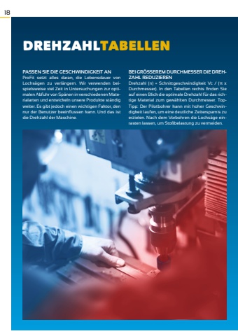 18PASSEN SIE DIE GESCHWINDIGKEIT ANProFit setzt alles daran, die Lebensdauer von Lochs%u00e4gen zu verl%u00e4ngern. Wir verwenden beispielsweise viel Zeit in Untersuchungen zur optimalen Abfuhr von Sp%u00e4nen in verschiedenen Materialarten und entwickeln unsere Produkte st%u00e4ndig weiter. Es gibt jedoch einen wichtigen Faktor, den nur der Benutzer beeinflussen kann. Und das ist die Drehzahl der Maschine. BEI GR%u00d6SSEREM DURCHMESSER DIE DREHZAHL REDUZIERENDrehzahl (n) = Schnittgeschwindigkeit Vc / (%u03c0 x Durchmesser). In den Tabellen rechts finden Sie auf einen Blick die optimale Drehzahl f%u00fcr das richtige Material zum gew%u00e4hlten Durchmesser. TopTipp: Der Pilotbohrer kann mit hoher Geschwindigkeit laufen, um eine deutliche Zeitersparnis zu erzielen. Nach dem Vorbohren die Lochs%u00e4ge einrasten lassen, um Sto%u00dfbelastung zu vermeiden.DREHZAHLTABELLEN