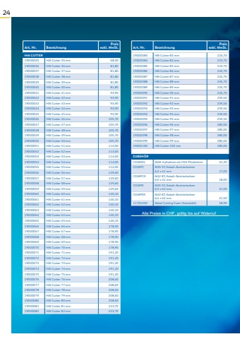 24Art. Nr. BezeichnungPreisexkl. MwSt.HM CUTTER19000035 HM Cutter 35 mm 68,50 19000036 HM Cutter 36 mm 81,80 19000037 HM Cutter 37 mm 81,80 19000038 HM Cutter 38 mm 81,80 19000039 HM Cutter 39 mm 81,80 19000040 HM Cutter 40 mm 81,80 19000041 HM Cutter 41 mm 93,90 19000042 HM Cutter 42 mm 93,90 19000043 HM Cutter 43 mm 93,90 19000044 HM Cutter 44 mm 93,90 19000045 HM Cutter 45 mm 93,90 19000046 HM Cutter 46 mm 105,70 19000047 HM Cutter 47 mm 105,70 19000048 HM Cutter 48 mm 105,70 19000049 HM Cutter 49 mm 105,70 19000050 HM Cutter 50 mm 105,70 19000051 HM Cutter 51 mm 114,00 19000052 HM Cutter 52 mm 114,00 19000053 HM Cutter 53 mm 114,00 19000054 HM Cutter 54 mm 114,00 19000055 HM Cutter 55 mm 114,00 19000056 HM Cutter 56 mm 129,60 19000057 HM Cutter 57 mm 129,60 19000058 HM Cutter 58 mm 129,60 19000059 HM Cutter 59 mm 129,60 19000060 HM Cutter 60 mm 140,10 19000061 HM Cutter 61 mm 140,10 19000062 HM Cutter 62 mm 140,10 19000063 HM Cutter 63 mm 140,10 19000064 HM Cutter 64 mm 140,10 19000065 HM Cutter 65 mm 140,10 19000066 HM Cutter 66 mm 178,90 19000067 HM Cutter 67 mm 178,90 19000068 HM Cutter 68 mm 178,90 19000069 HM Cutter 69 mm 178,90 19000070 HM Cutter 70 mm 178,90 19000071 HM Cutter 71 mm 191,20 19000072 HM Cutter 72 mm 191,20 19000073 HM Cutter 73 mm 191,20 19000074 HM Cutter 74 mm 191,20 19000075 HM Cutter 75 mm 191,20 19000076 HM Cutter 76 mm 208,60 19000077 HM Cutter 77 mm 208,60 19000078 HM Cutter 78 mm 208,60 19000079 HM Cutter 79 mm 208,60 19000080 HM Cutter 80 mm 208,60 19000081 HM Cutter 81 mm 223,70 19000082 HM Cutter 82 mm 223,70 Art. Nr. BezeichnungPreisexkl. MwSt.19000083 HM Cutter 83 mm 223,70 19000084 HM Cutter 84 mm 223,70 19000085 HM Cutter 85 mm 223,70 19000086 HM Cutter 86 mm 245,70 19000087 HM Cutter 87 mm 245,70 19000088 HM Cutter 88 mm 245,70 19000089 HM Cutter 89 mm 245,70 19000090 HM Cutter 90 mm 245,70 19000091 HM Cutter 91 mm 259,50 19000092 HM Cutter 92 mm 259,50 19000093 HM Cutter 93 mm 259,50 19000094 HM Cutter 94 mm 259,50 19000095 HM Cutter 95 mm 259,50 19000096 HM Cutter 96 mm 280,00 19000097 HM Cutter 97 mm 280,00 19000098 HM Cutter 98 mm 280,00 19000099 HM Cutter 99 mm 280,00 19000100 HM Cutter 100 mm 280,00 ZUBEH%u00d6RCDM001 MAX-Aufnahme mit HSS-Pilotbohrer 41,30CDMPC M35 5% Kobalt-Zentrierbohrer6,5 x 41 mm 17,00CDMPCX M42 8% Kobalt-Zentrierbohrer6,5 x 41 mm 18,00CDMPE M35 5% Kobalt-Zentrierbohrer6,5 x 62 mm. 21,00CDMPEX M42 8% Kobalt-Zentrierbohrer6,5 x 62 mm 21,5011750400 Metal Cutting Foam (Schneid%u00f6l) 18,90Alle Preise in CHF, g%u00fcltig bis auf Widerruf