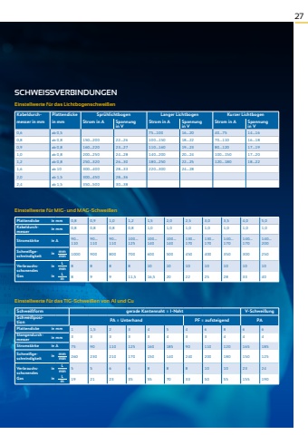 27SCHWEISSVERBINDUNGENEinstellwerte f%u00fcr das Lichtbogenschwei%u00dfen Kabeldurch- Plattendicke Spr%u00fchlichtbogen Langer Lichtbogen Kurzer Lichtbogenmesser in mm in mm Strom in A Spannung in VStrom in A Spannung in VStrom in A Spannung in V0,6 ab 0,5 75...100 16...20 40...75 14...160,8 ab 0,8 150...200 22...26 100...150 18...22 70...110 16...180,9 ab 0,8 160...220 23...27 110...160 19...23 80...120 17...191,0 ab 0,8 200...250 24...28 140...200 20...24 100...150 17...201,2 ab 0,8 250...320 26...30 180...250 22...25 120...180 18...221,6 ab 10 300...400 28...33 220...300 24...282,0 ab 1,5 300...450 28...362,4 ab 1,5 350...500 30...38Einstellwerte f%u00fcr MIG- und MAG-Schwei%u00dfenPlattendicke in mm 0,8 0,9 1,0 1,2 1,5 2,0 2,5 3,0 3,5 4,0 5,0Kabeldurchmesser in mm 0,8 0,8 0,8 0,8 1,0 1,0 1,0 1,0 1,0 1,0 1,0Stromst%u00e4rke in A 90...11090...11090...110100...125100...140100...140130...170130...170140...170140...170140...200Schwei%u00dfgeschwindigkeit in mmmin 1000 900 800 700 600 500 450 400 350 300 250VerbrauchsschonendesGasin Lmin 8 8 8 8 10 10 10 10 10 10 10in Lm 8 9 9 11,5 16,5 20 22 25 28 33 40Einstellwerte f%u00fcr das TIG-Schwei%u00dfen von Al und CuSchwei%u00dfform gerade Kantennaht = I-Naht V-Schwei%u00dfungSchwei%u00dfposition PA = Unterhand PF = aufsteigend PAPlattendicke in mm 1 1,5 2 3 4 5 4 6 8 6 6Stangendurchmesser in mm 3 3 3 3 3 4 3 3 4 4 4Stromst%u00e4rke in A 75 90 110 125 160 185 90 110 120 165 185Schwei%u00dfgeschwindigkeit in mmmin 260 230 210 170 150 140 240 200 180 150 125VerbrauchsschonendesGasin Lmin 5 5 6 6 8 8 8 10 10 23 24in Lm 19 21 23 35 55 70 33 50 55 155 190