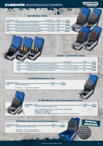 11515310 1 - 10 %u00d7 0,5 mm 39.00515311 1 - 13 %u00d7 0,5 mm 79.00515312 1 - 10 %u00d7 0,5 mm 69.00515313 1 - 13 %u00d7 0,5 mm 129.00515320 6.3 - 20.5 mm 65.00515321 3 - 14, 8 - 20, 16 - 30.5 mm 69.00515322 4 - 12, 4 - 20, 6 - 30 mm . 59.00515331 79.00515330 59.00515220 119.00 * alle Preise in CHF inkl. MWSt und vRGSpiralbohrer-S%u00e4tzeArtikelnummer Typ Durchmesser Anzahl Preis *D-19GS Spiralbohrersatz HSS-G, geschliffen 19tlg.D-25GS Spiralbohrersatz HSS-G, geschliffen 25tlg.D-19CO Spiralbohrersatz HSS-Cobalt, geschliffen 19tlg.D-25CO Spiralbohrersatz HSS-Cobalt, geschliffen 25tlg.Senker- und Sch%u00e4ler-S%u00e4tzeArtikelnummer Typ Durchmesser Anzahl Preis *D-6 Kegelsenkersatz 90%u00b0 HSS 4241, 3-phasig angeschliffen 6tlg.D-3TT Blechsch%u00e4lbohrersatz HSS, TIN, 3-phasig angeschliffen 3tlg.D-3 Mehrstufenbohrersatz, TIN, 3-phasig angeschliffen 3tlg.D-25GSH Holzbohrer-SetArtikelnummer Inhalt Anzahl Preis *D-25GSH Holzbohrer-Set 25tlg.25 Holzbohrer 1 - 13 mm in 0.5 mm SchrittenD-16R HSS Einschnitt-Gewindebohrer-SatzArtikelnummer Inhalt Anzahl Preis *D-16R HSS Einschnitt-Gewindebohrer-Satz 16tlg.7 Einschnittgewindebohrer HSS-G, M3 / M4 / M5 / M6 / M8 / M10 / M12Windeisen Nr. 1.1/2, L%u00e4nge 215 mmWerkzeughalter-Knarre 85 mm7 Kernlochbohrer Typ N HSS-G, zylindrisch 2,5 / 3,3 / 4,2 / 5,0 / 6,8 / 8.5 / 10,2 mmZUBEH%u00d6R BOHRMASCHINENHSS Bohrerkassette mit KernlochbohrerArtikelnummer Inhalt Anzahl Preis *HSS Bohrerkassette mit Kernlochbohrer 29tlg.HSS-Bohrer 1 - 13 mm in 0.5 mm SchrittenKernlochbohrer inkl. 4 Spezialgr%u00f6ssen M3 - M14SPEZIALGR%u00d6SSEN