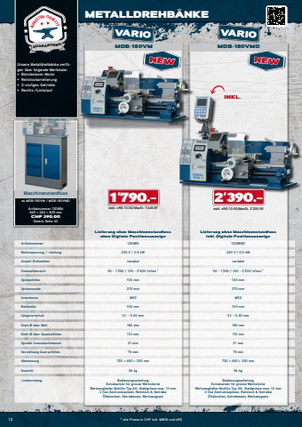 12MDB-180VM1%u2018790.%u2013MDB-180VMD2%u2018390.%u2013NEWNEWVARIOVARIO * alle Preise in CHF inkl. MWSt und vRGLieferung ohne Maschinenstandfussohne Digitale PositionsanzeigeLieferung ohne Maschinenstandfussinkl. Digitale PositionsanzeigeArtikelnummer 120885 120885DMotorspannung / -leistung 230 V / 0.5 kW 230 V / 0.5 kWAnzahl Drehzahlen variabel variabelDrehzahlbereich 50 - 1%u2018250 / 100 - 2%u2018500 U/min%u20131 50 - 1%u2018250 / 100 - 2%u2018500 U/min%u20131Spitzenh%u00f6he 100 mm 100 mmSpitzenweite 270 mm 270 mmInnenkonus MK3 MK3Bettbreite 100 mm 100 mmL%u00e4ngsvorschub 0.1 - 0.20 mm 0.1 - 0.20 mmDreh-%u00d8 %u00fcber Bett 180 mm 180 mmDreh-%u00d8 %u00fcber Querschlitten 110 mm 110 mmSpindel Innendurchmesser 21 mm 21 mmVerstellweg Querschlitten 75 mm 75 mmAbmessung 720 %u00d7 450 %u00d7 330 mm 720 %u00d7 450 %u00d7 330 mmGewicht 56 kg 56 kgLieferumfang BedienungsanleitungExtrabacken f%u00fcr grosse Werkst%u00fcckeWerkzeughalter Multifix Typ AA, Stahlgr%u00f6sse max. 10 mm2 fixe Zentrumsspitzen, Reitstock & Getriebe%u00d6lk%u00e4nnchen, Getriebesatz, WerkzeugsatzBedienungsanleitungExtrabacken f%u00fcr grosse Werkst%u00fcckeWerkzeughalter Multifix Typ AA, Stahlgr%u00f6sse max. 10 mm2 fixe Zentrumsspitzen, Reitstock & Getriebe%u00d6lk%u00e4nnchen, Getriebesatz, WerkzeugsatzMETALLDREHB%u00c4NKEexkl. vRG 10.00/MwSt. 1%u2018645.87 exkl. vRG 10.00/MwSt. 2%u2018200.92Maschinenstandfusszu MDB-180VM / MDB-180VMDArtikelnummer 120886645 %u00d7 240 %u00d7 805 mmCHF 390.00Details Seite 40Unsere Metalldrehb%u00e4nke verf%u00fcgen %u00fcber folgende Merkmale:%u2022 B%u00fcrstenloser Motor%u2022 Reitstockarretierung%u2022 2-stufiges Getriebe%u2022 Rechts-/LinkslaufINDUSTRY QUALITYGUARANTEEDINKL.