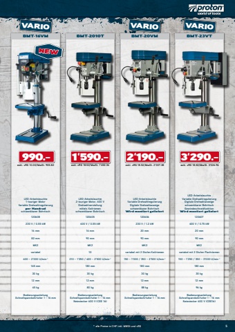 5BMT-16VM BMT-2010T BMT-20VM1%u2018590.%u2013 2%u2018190.%u2013BMT-23VT990.%u2013 3%u2018290.%u2013NEWVARIOVARIO VARIOexkl. vRG 18.52/MwSt. 1%u2018452.34 exkl. vRG 18.52/MwSt. 2%u2018007.38 exkl. vRG 18.52/MwSt. 3%u2018024.96 * alle Preise in CHF inkl. MWSt und vRGLED-Arbeitsleuchte1-touriger MotorVariable Drehzahlregulierungper Handradschwenkbarer BohrtischLED-Arbeitsleuchte2-touriger Motor, 400 VDrehzahlverstellungmittels Keilriemenschwenkbarer BohrtischLED-ArbeitsleuchteVariable DrehzahlregulierungDigitale Drehzahlanzeigeschwenkbarer BohrtischWird montiert geliefertLED-ArbeitsleuchteVariable DrehzahlregulierungDigitale Drehzahlanzeigeschwenkbarer BohrtischGewindeschneidfunktionWird montiert geliefert120608 120605 120606 120607230 V / 0.55 kW 400 V / 0.55 kW 230 V / 1.2 kW 400 V / 0.75 kW16 mm 16 mm 20 mm 20 mm82 mm 90 mm 90 mm 90 mmMK2 MK2 MK2 MK2variabel 10 variabel mit 2 Stufen Keilriemen variabel mit 2 Stufen Flachriemen400 %u2013 2%u2018000 U/min%u20131 210 %u2013 1%u2018250 / 420 %u2013 2%u2018500 U/min%u20131 150 %u2013 1%u2018000 / 350 %u2013 2%u2018500 U/min%u20131 150 %u2013 1%u2018250 / 350 %u2013 3%u2018000 U/min%u20131165 mm 180 mm 180 mm 180 mm30 kg 30 kg 30 kg 30 kg12 mm 12 mm 12 mm 12 mm45 kg 80 kg 88 kg 96 kgBedienungsanleitungSchnellspannbohrfutter 1 %u2013 16 mmBedienungsanleitungSchnellspannbohrfutter 1 %u2013 16 mmNetzstecker 400 V (CEE 16)BedienungsanleitungSchnellspannbohrfutter 1 %u2013 16 mmBedienungsanleitungSchnellspannbohrfutter 1 %u2013 16 mmNetzstecker 400 V (CEE16)exkl. vRG 10.00/MwSt. 905.82