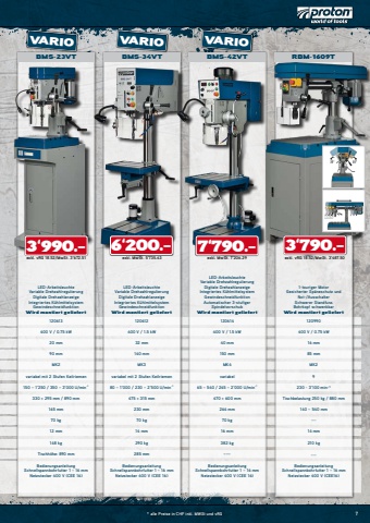 7BMS-23VT BMS-34VT3%u2018990.%u2013 6%u2018200.%u2013 7%u2018790.%u2013BMS-42VT RBM-1609T3%u2018790.%u2013VARIO VARIO VARIOLED-ArbeitsleuchteVariable DrehzahlregulierungDigitale DrehzahlanzeigeIntegriertes K%u00fchlmittelsystemGewindeschneidfunktionWird montiert geliefertLED-ArbeitsleuchteVariable DrehzahlregulierungDigitale DrehzahlanzeigeIntegriertes K%u00fchlmittelsystemGewindeschneidfunktionWird montiert geliefertLED-ArbeitsleuchteVariable DrehzahlregulierungDigitale DrehzahlanzeigeIntegriertes K%u00fchlmittelsystemGewindeschneidfunktionAutomatischer 3-stufigerSpindelvorschubWird montiert geliefert1-touriger MotorGesicherter Sp%u00e4neschutz undNot-/AusschalterSchwerer StandfussBohrkopf schwenkbarWird montiert geliefert120613 120612 120614 120990400 V / 0.75 kW 400 V / 1.5 kW 400 V / 1.5 kW 400 V / 0.75 kW20 mm 32 mm 40 mm 16 mm90 mm 140 mm 150 mm 85 mmMK2 MK3 MK4 MK2variabel mit 2 Stufen Keilriemen variabel mit 2 Stufen Keilriemen variabel 9150 %u2013 1%u2018250 / 350 %u2013 3%u2018000 U/min%u20131 80 %u2013 1%u2018000 / 230 %u2013 2%u2018500 U/min%u20131 65 %u2013 540 / 245 %u2013 2%u2018000 U/min%u20131 230 - 3%u2018100 min-%u00b9330 %u00d7 295 mm / 890 mm 475 %u00d7 315 mm 470 %u00d7 600 mm Tischbelastung 250 kg / 880 mm165 mm 230 mm 264 mm 140 %u2013 540 mm70 kg 70 kg 70 kg ---12 mm 14 mm 16 mm 14 mm148 kg 290 kg 382 kg 210 kgTischh%u00f6he: 890 mm 285 mm %u2013%u2013%u2013 ---BedienungsanleitungSchnellspannbohrfutter 1 %u2013 16 mmNetzstecker 400 V (CEE 16)BedienungsanleitungSchnellspannbohrfutter 1 %u2013 16 mmNetzstecker 400 V (CEE 16)BedienungsanleitungSchnellspannbohrfutter 1 %u2013 16 mmNetzstecker 400 V (CEE 16)BedienungsanleitungSchnellspannbohrfutter 1 %u2013 16 mmNetzstecker 400 V (CEE16)exkl. vRG 18.52/MwSt. 3%u2018672.51 exkl. MwSt. 5%u2018735.43 * alle Preise in CHF inkl. MWSt und vRGexkl. MwSt. 7%u2018206.29 exkl. vRG 18.52/MwSt. 3%u2018487.50