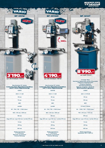 9BF-30VM BF-3212T8%u2018990.%u20133%u2018190.%u2013NEWVARIO VARIOBF-30VMDNEW4%u2018190.%u201345%u00b0Maschinenkopf 45%u00b0 drehbarLieferung ohne Maschinenstandfussohne 3-Achs-DigitalanzeigeMaschinenkopf 45%u00b0 drehbarLieferung ohne Maschinenstandfussinkl. 3-Achs-Digitalanzeige2-touriger MotorGesicherter Sp%u00e4neschutz und Not-/AusschalterIntegriertes K%u00fchlmittelsystemSchwerer StandfussGewindeschneidfunktionBohrkopf schwenkbar L=90%u00b0/R=30%u00b0Wird montiert geliefert120573 120573D 120820230 V / 1.1 kW 230 V / 1.1 kW 400 V / 0.75 kW30 mm 30 mm 32 mm70 mm 70 mm 120 mmMK3 MK3 MK3variabel variabel 12 (2x6) 2 Stufen50 %u2013 750 / 150 %u2013 2%u2018250 U/min%u20131 50 %u2013 750 / 150 %u2013 2%u2018250 U/min%u20131 50 %u2013 1%u2018250 / 100 %u2013 2%u2018500 U/min%u20131840 %u00d7 210 mm / 205 mm 840 %u00d7 210 mm / 205 mm 730 %u00d7 210 mm / 1%u2018010 mm180 mm 180 mm 275 mml%u00e4ngs 220 mm / quer 540 mm / vertikal 370 mm l%u00e4ngs 220 mm / quer 540 mm / vertikal 370 mm l%u00e4ngs 285 mm / quer 410 mm / vertikal 490 mm14 mm 14 mm 16 mm220 kg 220 kg 405 kg440 mm 440 mm 440 mmBedienungsanleitung2 T-NutensteineBohrfutter mit Schl%u00fcsselDiverses WerkzeugBedienungsanleitung2 T-NutensteineBohrfutter mit Schl%u00fcsselDiverses WerkzeugBedienungsanleitungNetzstecker 400 V (CEE 16) * alle Preise in CHF inkl. MWSt und vRGexkl. MwSt. 8%u2018316.37exkl. vRG 18.52/MwSt. 2%u2018932.45INKL.exkl. vRG 18.52/MwSt. 3%u2018857.52