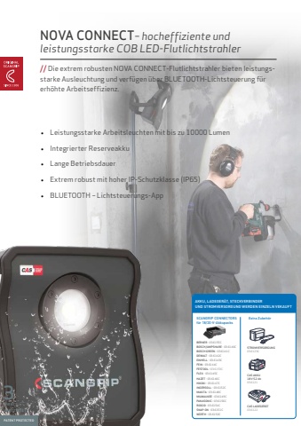 NOVA CONNECT%u2013 hocheffiziente und leistungsstarke COB LED-Flutlichtstrahler//Die extrem robusten NOVA CONNECT-Flutlichtstrahler bieten leistungsstarke Ausleuchtung und verf%u00fcgen %u00fcber BLUETOOTH-Lichtsteuerung f%u00fcr erh%u00f6hte Arbeitseffizienz.%u2022Leistungsstarke Arbeitsleuchten mit bis zu 10000 Lumen%u2022Integrierter Reserveakku%u2022Lange Betriebsdauer%u2022Extrem robust mit hoher IP-Schutzklasse (IP65)%u2022BLUETOOTH %u2013 Lichtsteuerungs-AppAKKU, LADEGER%u00c4T, STECKVERBINDERUND STROMVERSORGUNG WERDEN EINZELN VEKAUFTSCANGRIP CONNECTORS f%u00fcr 18/20-V-AkkupacksBERNER - 03.6155C BOSCH/AMPSHARE - 03.6140CBOSCH GREEN - 03.6141C DEWALT - 03.6142CEINHELL - 03.6143CFEIN - 03.6144CFESTOOL - 03.6153CFLEX - 03.6145CHAZET - 03.6146CHIKOKI - 03.6147CINGERSOLL - 03.6152CMAKITA - 03.6148CMILWAUKEE - 03.6149CPANASONIC - 03.6156C RIDGID - 03.6154CSNAP-ON - 03.6151CW%u00dcRTH - 03.6150C Extra Zubeh%u00f6rCAS AKKU18 V 5.2 Ah03.6121CAS LADEGER%u00c4T03.6122STROMVERSORGUNG03.6123C103PATENT PROTECTEDwarrantyyears