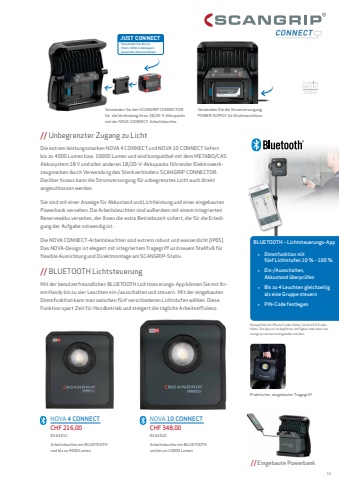 NOVA 4 CONNECTCHF 216,0003.6101CNOVA 10 CONNECTCHF 348,0003.6102CKompatibel mit iPhone 5oder h%u00f6her / Android 5.0oder h%u00f6her. Die App ist im AppStore verf%u00fcgbar oder kann von scangrip.com heruntergeladen werden.BLUETOOTH %u2013 Lichtsteuerungs-App%u2022Dimmfunktion mit f%u00fcnf Lichtstufen 10% - 100%%u2022Ein-/Ausschalten,Akkustand %u00fcberpr%u00fcfen%u2022Bis zu 4 Leuchten gleichzeitig als eine Gruppe steuern%u2022PIN-Code festlegenPraktischer, eingebauter Tragegriff //Eingebaute Powerbank// Unbegrenzter Zugang zu Licht Die extrem leistungsstarken NOVA 4 CONNECT und NOVA 10 CONNECT liefern bis zu 4000 Lumen bzw. 10000 Lumen und sind kompatibel mit dem METABO/CAS Akkusystem 18 V und allen anderen 18/20-V-Akkupacks f%u00fchrender Elektrowerkzeugmarken durch Verwendung des Steckverbinders SCANGRIP CONNECTOR. Dar%u00fcber hinaus kann die Stromversorgung f%u00fcr unbegrenztes Licht auch direkt angeschlossen werden. Sie sind mit einer Anzeige f%u00fcr Akkustand und Lichtleistung und einer eingebauten Powerbank versehen. Die Arbeitsleuchten sind au%u00dferdem mit einem integrierten Reserveakku versehen, der Ihnen die extra Betriebszeit sichert, die f%u00fcr die Erledigung der Aufgabe notwendig ist.Die NOVA CONNECT-Arbeitsleuchten sind extrem robust und wasserdicht (IP65). Das NOVA-Design ist elegant mit integriertem Tragegriff und neuem Stellfu%u00df f%u00fcr flexible Ausrichtung und Direktmontage am SCANGRIP-Stativ.// BLUETOOTH Lichtsteuerung Mit der benutzerfreundlichen BLUETOOTH Lichtsteuerungs-App k%u00f6nnen Sie mit Ihrem Handy bis zu vier Leuchten ein-/ausschalten und steuern. Mit der eingebauten Dimmfunktion kann man zwischen f%u00fcnf verschiedenen Lichtstufen w%u00e4hlen. Diese Funktion spart Zeit f%u00fcr Handbetrieb und steigert die t%u00e4gliche Arbeitseffizienz.Verwenden Sie die Stromversorgung POWER SUPPLY f%u00fcr DirektanschlussVerwenden Sie den SCANGRIP CONNECTOR f%u00fcr die Verbindung Ihres 18/20-V-Akkupacks mit der NOVA CONNECT-Arbeitsleuchte.Arbeitsleuchte mit BLUETOOTH und bis zu 10000 LumenArbeitsleuchte mit BLUETOOTHund bis zu 4000 LumenJUST CONNECTVerwenden Sie den zu Ihrem 18/20-V-Akkupack passenden Steckverbinder 11