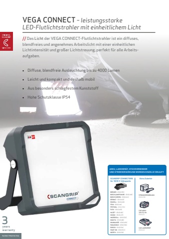 VEGA CONNECT %u2013 leistungsstarke LED-Flutlichtstrahler mit einheitlichem Licht// Das Licht der VEGA CONNECT-Flutlichtstrahler ist ein diffuses, blendfreies und angenehmes Arbeitslicht mit einer einheitlichen Lichtintensit%u00e4t und gro%u00dfer Lichtstreuung, perfekt f%u00fcr alle Arbeitsaufgaben.%u2022Diffuse, blendfreie Ausleuchtung bis zu 4000 Lumen%u2022Leicht und kompakt und deshalb mobil %u2022Aus besonders schlagfestem Kunststoff%u2022Hohe Schutzklasse IP54AKKU, LADEGER%u00c4T, STECKVERBINDERUND STROMVERSORGUNG WERDEN EINZELN VEKAUFTSCANGRIP CONNECTORS f%u00fcr 18/20-V-AkkupacksBERNER - 03.6155C BOSCH/AMPSHARE - 03.6140CBOSCH GREEN - 03.6141C DEWALT - 03.6142CEINHELL - 03.6143CFEIN - 03.6144CFESTOOL - 03.6153CFLEX - 03.6145CHAZET - 03.6146CHIKOKI - 03.6147CINGERSOLL - 03.6152CMAKITA - 03.6148CMILWAUKEE - 03.6149CPANASONIC - 03.6156C RIDGID - 03.6154CSNAP-ON - 03.6151CW%u00dcRTH - 03.6150C Extra Zubeh%u00f6rCAS AKKU18 V 5.2 Ah03.6121CAS LADEGER%u00c4T03.6122STROMVERSORGUNG03.6123C123PATENT PROTECTEDwarrantyyears