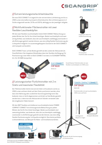 200oNOVA 2 CONNECTCHF 114,0003.6100C//Die mobile NOVA 2 CONNECT Bietet mit der neuesten COB-LED-Hochleistungstechnologie bis zu 2000 Lumen. Mit der eingebauten Dimmfunktion kann man je nach Arbeitsaufgabe zwischen f%u00fcnf verschiedenen Lichtstufen w%u00e4hlen. Die Arbeitsleuchte wird auch mit einer Anzeige f%u00fcr Akkustand und Lichtleistung geliefert.NOVA 2 CONNECT ist kompatibel mit dem METABO/CAS Akkusystem 18 V und allen anderen 18/20-V-Akkupacks f%u00fchrender Elektrowerkzeugmarken durch Verwendung des Steckverbinders SCANGRIP CONNECTOR. Dar%u00fcber hinaus kann die Stromversorgung POWER SUPPLY f%u00fcr unbegrenzte Lichtverf%u00fcgbarkeit auch direkt angeschlossen werden.Mit der flexiblen St%u00fctze und dem eingebauten Haken l%u00e4sst sich die NOVA 2 CONNECT f%u00fcr den optimalen Beleuchtungswinkel einfach drehen.Das Geh%u00e4use aus robustem Alu-Spritzguss ist widerstandsf%u00e4hig gegen%u00fcber starken St%u00f6%u00dfen, Schl%u00e4gen und Vibrationen. Die robuste Konstruktion der NOVA2 CONNECT ist f%u00fcr anspruchsvolle, raue Arbeitsumgebungen perfekt geeignet.Als Extrafunktion verf%u00fcgt sie %u00fcber eine eingebaute Powerbank mit USB-Buchse zum Aufladen von mobilen Einheiten.Verwenden Sie den SCANGRIP CONNECTOR f%u00fcr die Verbindung Ihres 18/20-V-Akkupacks mit der NOVA 2 CONNECT-ArbeitsleuchteVerwenden Sie die Stromversorgung POWER SUPPLY f%u00fcr Direktanschluss5-stufige DimmfunktionHaken f%u00fcr flexible PositionierungArbeitsleuchte mit bis zu 2000 Lumen JUST CONNECTVerwenden Sie den zu Ihrem 18/20-V-Akkupack passenden Steckverbinder 9