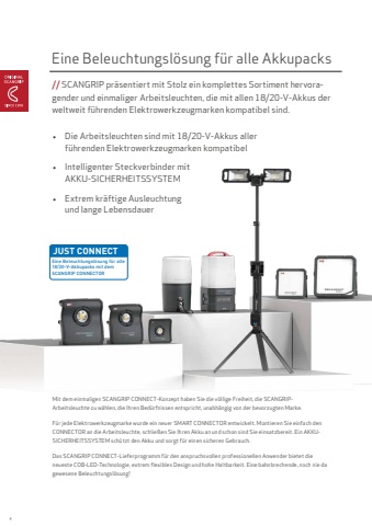 Mit dem einmaligen SCANGRIP CONNECT-Konzept haben Sie die v%u00f6llige Freiheit, die SCANGRIPArbeitsleuchte zu w%u00e4hlen, die Ihren Bed%u00fcrfnissen entspricht, unabh%u00e4ngig von der bevorzugten Marke.F%u00fcr jede Elektrowerkzeugmarke wurde ein neuer SMART CONNECTOR entwickelt. Montieren Sie einfach den CONNECTOR an die Arbeitsleuchte, schlie%u00dfen Sie Ihren Akku an und schon sind Sie einsatzbereit. Ein AKKUSICHERHEITSSYSTEM sch%u00fctzt den Akku und sorgt f%u00fcr einen sicheren Gebrauch.Das SCANGRIP CONNECT-Lieferprogramm f%u00fcr den anspruchsvollen professionellen Anwender bietet die neueste COB-LED-Technologie, extrem flexibles Design und hohe Haltbarkeit. Eine bahnbrechende, noch nie da gewesene Beleuchtungsl%u00f6sung!Eine Beleuchtungsl%u00f6sung f%u00fcr alle Akkupacks// SCANGRIP pr%u00e4sentiert mit Stolz ein komplettes Sortiment hervoragender und einmaliger Arbeitsleuchten, die mit allen 18/20-V-Akkus der weltweit f%u00fchrenden Elektrowerkzeugmarken kompatibel sind.%u2022Die Arbeitsleuchten sind mit 18/20-V-Akkus aller f%u00fchrenden Elektrowerkzeugmarken kompatibel%u2022Intelligenter Steckverbinder mit AKKU-SICHERHEITSSYSTEM%u2022Extrem kr%u00e4ftige Ausleuchtung und lange LebensdauerJUST CONNECTEine Beleuchtungsl%u00f6sung f%u00fcr alle 18/20-V-Akkupacks mit dem SCANGRIP CONNECTOR4