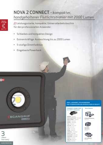 // Leistungsstarke, kompakte, Universalarbeitsleuchte f%u00fcr den professionellen Anwender.NOVA 2 CONNECT%u2013 kompakter, handgehaltener Flutlichtstrahler mit 2000 Lumen%u2022Schlankes und kompaktes Design%u2022Extrem kr%u00e4ftige Ausleuchtung bis zu 2000 Lumen%u20225-stufige Dimmfunktion%u2022Eingebaute PowerbankAKKU, LADEGER%u00c4T, STECKVERBINDERUND STROMVERSORGUNG WERDEN EINZELN VEKAUFTSCANGRIP CONNECTORS f%u00fcr 18/20-V-AkkupacksBERNER - 03.6155C BOSCH/AMPSHARE - 03.6140CBOSCH GREEN - 03.6141C DEWALT - 03.6142CEINHELL - 03.6143CFEIN - 03.6144CFESTOOL - 03.6153CFLEX - 03.6145CHAZET - 03.6146CHIKOKI - 03.6147CINGERSOLL - 03.6152CMAKITA - 03.6148CMILWAUKEE - 03.6149CPANASONIC - 03.6156C RIDGID - 03.6154CSNAP-ON - 03.6151CW%u00dcRTH - 03.6150C Extra Zubeh%u00f6rCAS AKKU18 V 5.2 Ah03.6121CAS LADEGER%u00c4T03.6122STROMVERSORGUNG03.6123C83PATENT PROTECTEDwarrantyyears