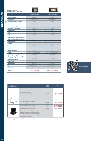 SITE LIGHT 40 SITE LIGHT 80Product number03.526803.5269Light source432 SMD LEDs864 SMD LEDsLED performance, lumen/W189189Luminous flux, lumen10000-4000020000-80000Iluminance, lux@0.5 m--Adjustable light output4 levels4 levelsBeam angle120%u00b0120%u00b0CRIRa > 80Ra > 80CCT6000 K6000 KOperating time with max. lumen, hOperating time with min. lumen, h--Charging time, h--Battery--Protection classIP65IP65Impact protectionIK08IK08Impact resistance1 m1 mCable10 m / 3 x 1 mm2 H07RN-F10 m / 3 x 1 mm2 H07RN-FOperating voltage AC220-240 V220-240 VCharging voltage/current DC--Power consumption Max 315 W Max 630 WCharger incl.--Temperature-25 to +40 %u00b0C -25 to +40 %u00b0CDimensions278 x 241 x 160 mm415 x 241 x 160 mmNet weight4.95 kg 6.70 kgPriceCHF 736,00CHF 1.231,00WORK LIGHTSSITE LIGHT series ACCESSORIESProductnumberPriceSCANGRIP TRIPOD 4.5m Air cushioned tripod for positioning ofSITE LIGHTs, 2.2 - 4.5 m03.5270CHF 311,00DUAL BRACKET for 4.5m TRIPODFor positioning of two SITE LIGHTs03.5758CHF 62,00TRANSPORT CASE SITE LIGHT 80TRANSPORT CASE SITE LIGHT 40 49.035149.0350CHF 198,00CHF 112,00The transport cases enable you to safely transport your SITE LIGHT work light to the building site. They are sturdy and high-quality cases that can withstand shocks and rough handling during transport.Go to scangrip.com to see other accessories availableSEE MORE ABOUTSITE LIGHT10