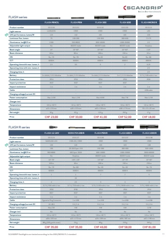 SCANGRIP flashlights are tested according to the ANSI/NEMA FL1 standardFLASH R seriesFLASH series FLASH PENCIL FLASH PEN FLASH 300 FLASH 600 FLASH MICRO RProduct number03.513003.513103.513203.513303.5113Light sourceLUMILEDSCREECREECREELEDLED performance, lumen/W124142165165103Luminous flux, lumen75100-200150-300300-6007.5-75Illuminance, lux@0.5 m1500500-8000600-100001000-200002.5Adjustable light outputNoBOOST modeBOOST modeBOOST modeSteplessBeam angle15%u00b010%u00b0-60%u00b010%u00b0-60%u00b010%u00b0-60%u00b0110%u00b0Beam distance40 m80 m100 m150 m10 mCRIRa > 70Ra > 70Ra >65Ra >65Ra > 80CCT6000 K6000 K6000 K6000 K6000 KOperating time with max. lumen, h2.53.5320.25Operating time with min. lumen, h----2.5Charging time, h----2.5Battery 2 x AAAA / 1.5 V Alkaline 2 x AAA / 1.5 V Alkaline 3 x AAA / 1.5 V Alkaline 2 x C / 1.5 V Alkaline 3.7 V / 100 mAh Li-ionProtection class IP54IP54 IP54 IP54IP20Impact protection IK07IK07IK07IK07Impact resistance1 m1 m1 m1 m1 mCableUSB cableCharging voltage/current DC-----Power consumptionMax 1.6 WMax 1.2 WMax 4.8 WMax 7 WMax 1.2 WCharger incl.-----Temperature-10 to +40 %u00b0C-10 to +40 %u00b0C-10 to +40 %u00b0C-10 to +40 %u00b0C-10 to +40 %u00b0CDimensions%u00f815 x 131mm%u00f820 x 153 mm%u00f832 x 133 mm%u00f836 x 174 mm55 x 15 x 25 mmNet weight32 g62 g122 g292 g17 gPriceCHF 23,00 CHF 33,00 CHF 41,00 CHF 52,00 CHF 18,00 FLASH 12-24VWORK PEN 200 R FLASH PEN R FLASH 600 R FLASH 1000 RProduct number03.512403.512703.513603.513703.5138Light sourceSAMSUNG LEDCOB LED / CREECREECREECREELED performance, lumen/W140120165165148Luminous flux, lumen13020-200 Spot: 150150-300300-600500-1000Illuminance, lux@0.5 m900-8000400 Spot: 3500600-100001000-200003000-60000Adjustable light outputNoSteplessBOOST modeBOOST modeBOOST modeBeam angle10%u00b0-70%u00b0105%u00b0 / 20%u00b010%u00b0-60%u00b010%u00b0-70%u00b010%u00b0-60%u00b0Beam distance100 m40 m100 m150 m250 mCRIRa > 70Ra > 80Ra > 65Ra > 65Ra > 70CCT6000 K6000 K6000 K6000 K6000 KOperating time with max. lumen, h11775Operating time with min. lumen, h10Charging time, h22.5344Battery 3.7 V / 550 mAh Li-ion 3.7 V / 750 mAh Li-ion 3.7V / 1100 mAh Li-ion 3.7V / 2600 mAh Li-ion 3.7V / 4000 mAh Li-ionProtection class IP30IP30 IP54 IP54 IP54Impact protectionIK07IK07IK07IK07IK07Impact resistance1 m1 m1 m1 m1 mCable Cigarette Plug Connector1 m USB1 m USB1 m USB1 m USBCharging voltage/current DC 10-28 V5 V / 1 A5 V / 1 A5 V / 1 A5 V / 2 APower consumptionMax 2 W4 W4 W6 W12 WCharger incl.NoNoNoNoNoTemperature-10 to +40 %u00b0C-10 to +40 %u00b0C-10 to +40 %u00b0C-10 to +40 %u00b0C-10 to +40 %u00b0CDimensions%u00f830 x 105 mm%u00f821 x 172 mm%u00f824 x 169 mm%u00f838 x 185 mm %u00f842 x 196 mmNet weight 88 g (100 g with cover)54 g83 g253 g345 gPriceCHF 35,00 CHF 35,00 CHF 46,00 CHF 58,00 CHF 81,0011