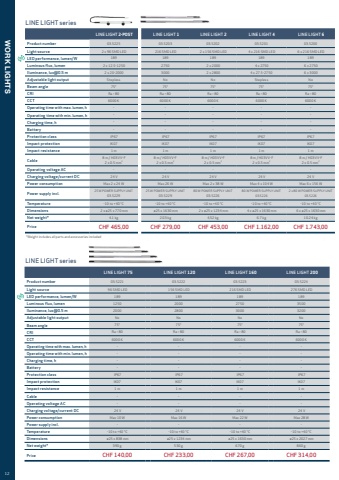LINE LIGHT series LINE LIGHT 75 LINE LIGHT 120 LINE LIGHT 160 LINE LIGHT 200Product number03.522103.522203.522303.5224Light source 96 SMD LED 156 SMD LED 216 SMD LED 276 SMD LEDLED performance, lumen/W189189189189Luminous flux, lumen1250200027503500Iluminance, lux@0.5 m2000280030003200Adjustable light outputNoNoNoNoBeam angle75%u00b075%u00b075%u00b075%u00b0CRIRa > 80Ra > 80Ra > 80Ra > 80CCT6000 K6000 K6000 K6000 KOperating time with max. lumen, h----Operating time with min. lumen, hCharging time, hBatteryProtection class IP67 IP67 IP67 IP67Impact protectionIK07IK07IK07IK07Impact resistance1 m1 m1 m1 mCableOperating voltage ACCharging voltage/current DC 24 V 24 V24 V 24 VPower consumptionMax 10 WMax 16 WMax 22 WMax 28 WPower supply incl.Temperature-10 to +40 %u00b0C-10 to +40 %u00b0C-10 to +40 %u00b0C-10 to +40 %u00b0CDimensions %u00f825 x 838 mm %u00f825 x 1234 mm %u00f825 x 1630 mm %u00f825 x 2027 mmNet weight*390 g530 g670 g860 gPriceCHF 140,00CHF 233,00CHF 267,00CHF 314,00WORK LIGHTS LINE LIGHT 2-POST LINE LIGHT 1 LINE LIGHT 2 LINE LIGHT 4 LINE LIGHT 6Product number03.522503.520303.520203.520103.5200Light source 2 x 96 SMD LED 216 SMD LED 2 x 156 SMD LED 4 x 216 SMD LED 6 x 216 SMD LEDLED performance, lumen/W189189189189189Luminous flux, lumen 2 x 12.5-12502750 2 x 2000 4 x 2750 6 x 2750Iluminance, lux@0.5 m 2 x 20-20003000 2 x 28004 x 27.5-2750 6 x 3000Adjustable light outputSteplessNoNoSteplessNoBeam angle75%u00b075%u00b075%u00b075%u00b075%u00b0CRIRa > 80Ra > 80Ra > 80Ra > 80Ra > 80CCT6000 K6000 K6000 K6000 K6000 KOperating time with max. lumen, hOperating time with min. lumen, h-----Charging time, hBattery-----Protection class IP67 IP67IP67IP67IP67Impact protectionIK07IK07IK07IK07IK07Impact resistance1 m1 m1 m1 m1 mCable 8 m / H03VV-F 2 x 0.5 mm28 m / H03VV-F 2 x 0.5 mm2 8 m / H03VV-F 2 x 0.5 mm2 8 m / H03VV-F 2 x 0.5 mm2 8 m / H03VV-F 2 x 0.5 mm2Operating voltage ACCharging voltage/current DC 24 V 24 V24 V 24 V24 VPower consumptionMax 2 x 24 WMax 26 WMax 2 x 38 WMax 4 x 104 WMax 6 x 156 WPower supply incl.25 W POWER SUPPLY UNIT03.522925 W POWER SUPPLY UNIT03.522980 W POWER SUPPLY UNIT03.522680 W POWER SUPPLY UNIT03.52262 x 80 W POWER SUPPLY UNIT03.5226Temperature-10 to +40 %u00b0C-10 to +40 %u00b0C-10 to +40 %u00b0C-10 to +40 %u00b0C-10 to +40 %u00b0CDimensions 2 x %u00f825 x 770 mm %u00f825 x 1630 mm 2 x %u00f825 x 1234 mm 4 x %u00f825 x 1630 mm 6 x %u00f825 x 1630 mmNet weight*4.1 kg 2.03 kg4,52 kg6.7 kg10.24 kgPriceCHF 465,00 CHF 279,00 CHF 453,00 CHF 1.162,00 CHF 1.743,00LINE LIGHT series*Weight includes all parts and accessories included12