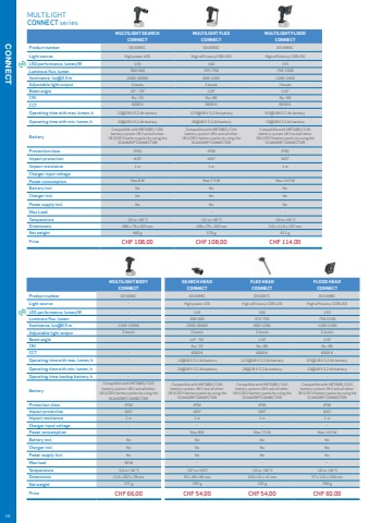 MAG PEN 3 MINI MAG PRO MAG MAG PROProduct number03.511603.569203.540003.5690Light sourceCOB LEDSpot: CREE XP-G2 COB LEDSpot: High power LED 10 SMD LEDsSpot: High power LED COB LEDSpot: High power LEDLED performance, lumen/W180165118185Luminous flux, lumen15-150 Spot: 8020-200 Spot: 80150-300 Spot: 8060-600 Spot: 150Iluminance, lux@0.5 m200 Spot: 200035-350 Spot: 700250-500 Spot: 85090-900 Spot: 2000Adjustable light outputSteplessStepless2 levelsSteplessCRIRa > 80Ra > 80 Ra > 80Ra > 80CCT6000 K6000 K6000 K6000 KOperating time with max. lumen, h 222.51.5Operating time with min. lumen, h2020515Charging time, h3.5344Battery 3.7 V / 750 mAh Li-on 3.7 V / 1200 mAh Li-ion 3.7 V / 2200 mAh Li-ion 3.7 V / 2600 mAh Li-ionProtection classIP20 IP54IP20IP54Impact protectionIK07IK07IK07IK07Impact resistance1 m1 m1 m1 mCable1 m USB 1 m USB 1 m USB 1 m USBOperating voltage ACCharging voltage/current DC5 V / 1 A5 V / 1 A5 V / 1 A5 V / 1 APower consumptionMax 2.5 WMax 2.5 WMax 3.5 WMax 6.5 WCharger incl.NoNoCountry dependedCountry dependedTemperature-10 to +40 %u00b0C-10 to +40 %u00b0C-10 to +40 %u00b0C-10 to +40 %u00b0CDimensions 174 x 31 x 21 mm 200 x 40 x 28 mm 260 x 61 x 43 mm 261 x 62 x 43 mmNet weight 78 g 157 g 252 g339 gPriceCHF 44,00CHF 50,00CHF 61,00CHF 75,00 WORK LIGHTSMAG seriesUNIFORM series UNIPEN MINIFORM UNIFORM SUPERFORM UV-FORMProduct number03.542003.540403.540703.5406CH.A03.5408Light source COB LEDSpot: High power LED COB LEDSpot: High power LED COB LEDSpot: High power LED COB LED COB LED Spot: High power UV-lightLED performance, lumen/W125165150130128Luminous flux, lumen75-150 Spot: 75100-200 Spot: 120250-500 Spot: 175750125-250 Spot: UVIluminance, lux@0.5 m125-250 Spot: 900100-200 Spot: 800475-950 Spot: 60001000200-400 Spot: UVAdjustable light output2 levels2 levels2 levelsNo2 levelsBeam angle110%u00b0CRIRa > 80Ra > 80Ra > 80Ra > 80Ra > 80CCT6000 K6000 K6000 K6000 K6000 KOperating time with max. lumen, h2322.5Operating time with min. lumen, h464.55Charging time, h2.535-3Battery 3.7 V / 750 mAh Li-ion 3.7 V / 1600 mAh Li-ion 3.6 V / 3000 mAh Li-ion 3.7 V / 1600 mAh Li-ionProtection class IP65 IP65IP65 IP54 IP20Impact protectionIK07IK07IK07IK08IK07Impact resistance1 m1 m1 m1 m1 mCable1 m USB1 m USB1 m USB5 m HO5RN-F 2x1 mm21 m USBOperating voltage AC--- 100-240 V-Charging voltage/current DC5 V / 1 A5 V / 1 A5 V / 1 A5 V / 1 APower consumptionMax 1.5 WMax 2.5 WMax 6 WMax 8 WMax 3 WCharger incl.NoCountry dependedCountry dependedCountry dependedTemperature-10 to +40 %u00b0C-10 to +40 %u00b0C-10 to +40 %u00b0C-10 to +40 %u00b0C-10 to +40 %u00b0CDimensions 155 x 27 x 21 mm 122 x 60 x 28 mm 190 x 60 x 32 mm 270 x 49 x 31mm 155 x 60 x 32 mmNet weight 80 g 130 g 263 g710 g 156 gPriceCHF 53,00 CHF 66,00 CHF 104,00 CHF 72,00 CHF 87,00 04