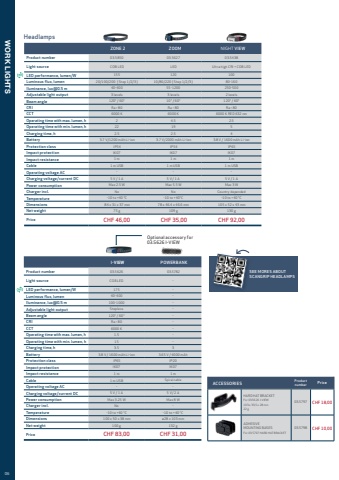 WORK LIGHTSHeadlampsZONE 2 ZOOM NIGHT VIEWProduct number03.585003.562703.5438Light source COB LED LEDUltra high CRI + COB LEDLED performance, lumen/W155120100Luminous flux, lumen20/100/200 ( Step 1/2/3 ) 10/80/220 ( Step 1/2/3 )80-160Iluminance, lux@0.5 m40-40055-1200250-500Adjustable light output3 levels3 levels2 levelsBeam angle120%u00b0 / 60%u00b010%u00b0 / 60%u00b0120%u00b0 / 60%u00b0CRIRa > 80Ra > 80Ra > 80CCT6000 K6000 K6000 K RED 632 nmOperating time with max. lumen, h24.52.5Operating time with min. lumen, h22195Charging time, h2.52.54Battery 3.7 V/1200 mAh Li-ion 3.7 V/2000 mAh Li-ion3.8 V / 1600 mAhLi-ionProtection class IP54 IP54 IP65Impact protectionIK07IK07IK07Impact resistance1 m1 m1 mCable1 m USB1 m USB1 m USBOperating voltage ACCharging voltage/current DC5 V / 1 A5 V / 1 A5 V / 1 APower consumptionMax 2.5 WMax 5.5 WMax 3 WCharger incl.NoNoCountry dependedTemperature-10 to +40 %u00b0C-10 to +40%u00b0C-10 to +40 %u00b0CDimensions 84 x 31 x 37 mm78 x 46.4 x 46.6 mm 105 x 52 x 43 mmNet weight75 g109 g130 gPriceCHF 46,00 CHF 35,00CHF 92,00 I-VIEW POWERBANKProduct number03.562603.5782Light sourceCOB LEDLED performance, lumen/W175Luminous flux, lumen40-400Iluminance, lux@0.5 m100-1000 -Adjustable light outputSteplessBeam angle120%u00b0 / 60%u00b0CRIRa > 80-CCT6000 KOperating time with max. lumen, h1.5Operating time with min. lumen, h15-Charging time, h3.53Battery3.8 V / 1600 mAh Li-ion3.65 V / 4000 mAhProtection class IP65IP20Impact protectionIK07IK07Impact resistance1 m1 mCable1 m USBSpiral cableOperating voltage ACCharging voltage/current DC5 V / 1 A5 V/ 2 APower consumptionMax 3.25 WMax 8 WCharger incl.No-Temperature-10 to +40 %u00b0C-10 to +40 %u00b0CDimensions 100 x 50 x 38 mm%u00f828 x 103 mmNet weight100 g132 gPriceCHF 83,00CHF 31,00Optional accessory for 03.5626 I-VIEWSEE MORES ABOUT SCANGRIP HEADLAMPS06ACCESSORIESProductnumberPrice HARD HAT BRACKET For 03.5626 I-VIEW103 x 33,5 x 28 mm22 g03.5797CHF 18,00ADHESIVE MOUNTING BASES For 03.5797 HARD HAT BRACKET03.5798CHF 10,00