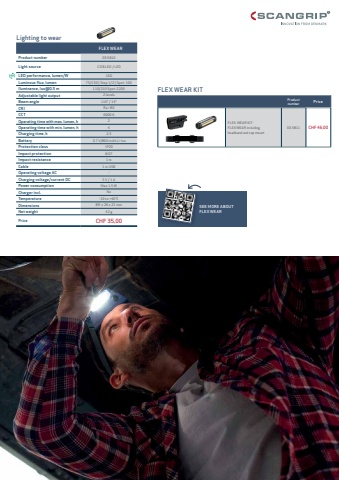 Lighting to wear FLEX WEAR Product number03.5810Light source COB LED / LEDLED performance, lumen/W160Luminous flux, lumen75/150 ( Step 1/2 ) Spot: 100Iluminance, lux@0.5 m110/210 Spot: 2200Adjustable light output2 levelsBeam angle110%u00b0 / 14%u00b0CRIRa > 80CCT6000 KOperating time with max. lumen, h2Operating time with min. lumen, h4Charging time, h2.5Battery 3.7 V/800 mAh Li-ionProtection class IP20Impact protectionIK07Impact resistance1 mCable1 m USBOperating voltage ACCharging voltage/current DC5 V / 1 APower consumptionMax 1.5 WCharger incl.NoTemperature-10 to +40%u00b0CDimensions89 x 26 x 21 mmNet weight42 gPriceCHF 35,00SEE MORE ABOUT FLEX WEAR07ProductnumberPrice FLEX WEAR KIT :FLEX WEAR including headband and cap mount03.5811CHF 46,00FLEX WEAR KIT