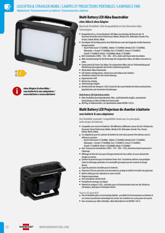 Multi Battery LED Akku Baustrahlerohne Akku & ohne AdapterMaximale Flexibilit%u00e4t. Volle Kompatibilit%u00e4t mit den f%u00fchrenden AkkuTechnologien.%u25a0 Kompatibel mit ca. 44 verschiedenen 18V Akkus (verschiedene Ah Klassen) der 10 Powertool-Hersteller: Bosch Professional, Makita, Metabo/CAS, Milwaukee, Dewalt, Flex, Festool, Einhell, W%u00fcrth, Hikoki .%u25a0 Die Adapter f%u00fcr die Akkusysteme ihrer Wahl k%u00f6nnen unter den folgenden Artikel-Nummern bezogen werden:%u2013 Bosch Professional 1172640063, Makita 1172640064, Metabo/CAS 1172640065, Milwaukee + Dewalt 1172640066, Flex 1172640072, Festool 1172640073, Einhell 1172640078, W%u00fcrth 1172640080, Hikoki 1172640081 %u25a0 Mit 4 Schaltstufen (100% - 75% - 50% - 25%), direkt volle Power beim Einschalten.%u25a0 Akku-Zustandsanzeige f%u00fcr die Restenergie des eingesetzten Akkus, die Akkus sind extern zu laden.%u25a0 Schutzsystem f%u00fcr Power-Tool Akkus: Die eingesetzten Akkus sind vor Tiefenentladung und %u00dcberhitzung (hervorgerufen durch hohe Laststr%u00f6me) gesch%u00fctzt.%u25a0 Abnehmbare Akku Schutzhaube.%u25a0 LED Strahler mit Kippschutz, sch%u00fctzt Linse und Geh%u00e4use des Strahlers.%u25a0 Standfestes Geh%u00e4use f%u00fcr eine sichere Nutzung.%u25a0 Ergonomischer Griff.%u25a0 Mit Ein/Aus Schalter.%u25a0 Stativmontage m%u00f6glich.%u25a0 Betriebsmittel der Kategorie 2 (K2): Einsatz f%u00fcr den rauen Betrieb mit hohen mechanischen, physikalischen und chemischen Einwirkungen.Multi Battery LED Hybrid Baustrahler:%u25a0 Mehr Flexibilit%u00e4t durch Hybridtechnik: Akku- und Netzbetrieb m%u00f6glich, automatische Umschaltung von Netz auf Akku bei Stromausfall.%u25a0 Mit Plug-In-Kabelanschluss, 5m abnehmbares Kabel H07RN-F 2X1,0.Multi Battery LED Projecteur de chantier %u00e0 batteriesans batterie & sans adaptateurUne flexibilit%u00e9 maximale. Compatibilit%u00e9 totale avec les principales technologies de batteries.%u25a0 Compatible avec environ 44 batteries 18V diff%u00e9rentes (diff%u00e9rentes classes Ah) des 10 fabricants Powertool: Bosch Professional, Makita, Metabo/CAS, Milwaukee, Dewalt, Flex, Festool, Einhell, W%u00fcrth, Hikoki.%u25a0 Les adaptateurs pour les syst%u00e8mes de batterie de votre choix peuvent %u00eatre obtenus sous les r%u00e9f%u00e9rences suivantes%u00a0:%u2013 Bosch Professional 1172640063, Makita 1172640064, Metabo/CAS 1172640065, Milwaukee + Dewalt 1172640066, Flex 1172640072, Festool 1172640073, Einhell 1172640078, W%u00fcrth 1172640080, Hikoki 1172640081 %u25a0 Avec 4 niveaux de commutation (100% - 75% - 50% - 25%), directement pleine puissance %u00e0 l%u2019allumage.%u25a0 Affichage de l%u2019%u00e9tat de l%u2019accu pour l%u2019%u00e9nergie restante de l%u2019accu utilis%u00e9, les accus doivent %u00eatre charg%u00e9s en externe.%u25a0 Syst%u00e8me de protection pour les batteries Power-Tool%u00a0: les batteries utilis%u00e9es sont prot%u00e9g%u00e9es contre les d%u00e9charges profondes et la surchauffe (provoqu%u00e9e par des courants de charge %u00e9lev%u00e9s).%u25a0 Capot de protection amovible pour les batteries.%u25a0 Projecteur LED avec protection anti-basculement, prot%u00e8ge la lentille et le bo%u00eetier du projecteur.%u25a0 Bo%u00eetier stable pour une utilisation en toute s%u00e9curit%u00e9.%u25a0 Poign%u00e9e ergonomique.%u25a0 Avec interrupteur marche/arr%u00eat.%u25a0 Possibilit%u00e9 de montage sur tr%u00e9pied.%u25a0 Mat%u00e9riel de cat%u00e9gorie 2 (K2)%u00a0: utilisation pour un fonctionnement rude avec des influences m%u00e9caniques, physiques et chimiques %u00e9lev%u00e9es.Projecteur LED Hybrid MULTI%u00a0:%u25a0 Plus de flexibilit%u00e9 gr%u00e2ce %u00e0 la technologie hybride%u00a0: possibilit%u00e9 de fonctionnement sur batterie et sur secteur, basculement automatique du secteur vers la batterie en cas de panne de courant.%u25a0 Avec connexion par c%u00e2ble enfichable, c%u00e2ble d%u00e9tachable de 5m H07RN-F 2X1.0.ohne Adapter & ohne Akku /sans batterie & sans adaptateur /senza batteria e senza adattatori iLEUCHTEN & STRAHLER MOBIL/LAMPES ET PROJECTEURS PORTABLES/LAMPADE E FARIAkkubetrieb/ Fonctionnement sur batterie/ Funzionamento a batteria12 WWW.BRENNENSTUHL.COM