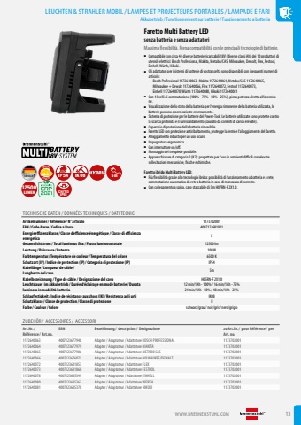 ROBUSTSPECIALIP54 IK08 5m12500LUMENLEUCHTEN & STRAHLER MOBIL/LAMPES ET PROJECTEURS PORTABLES/LAMPADE E FARIAkkubetrieb/ Fonctionnement sur batterie/ Funzionamento a batteriaWWW.BRENNENSTUHL.COM 13TECHNISCHE DATEN / DONN%u00c9ES TECHNIQUES / DATI TECNICIArtikelnummer/ R%u00e9f%u00e9rence / N%u00b0 articolo 1173702001EAN/ Code-barre / Codice a Barre 4007123681921Energieeffizienzklasse / Classe d%u2019efficience %u00e9nerg%u00e9tique / Classe di efficienza energetica EGesamtlichtstrom / Total luminous flux / Flusso luminoso totale 12500 lmLeistung / Puissance / Potenza 100 WFarbtemperatur/ Temp%u00e9rature de couleur/ Temperatura del colore 6500 KSchutzart (IP)/ Indice de protection (IP)/ Categoria di protezione (IP) IP54Kabell%u00e4nge / Longueur de c%u00e2ble / Lunghezza del cavo 5mKabelbezeichnung / Type de c%u00e2ble / Designazione del cavo H05RN-F 2X1,0Leuchtdauer im Akkubetrieb / Dur%u00e9e d%u2018%u00e9clairage en mode batterie / Durata luminosa in modalit%u00e0 batteria12 min/1Ah - 100% / 16 min/1Ah - 75% 24 min/1Ah - 50% / 48 min/1Ah - 25%Schlagfestigkeit/ Indice de r%u00e9sistance aux chocs (IK)/ Resistenza agli urti IK08Schutzklasse / Classe de protection / Classe di protezione IIFarbe / Couleur/ Colore schwarz/grau/ noir/gris/ nero/grigioZUBEH%u00d6R / ACCESSOIRES/ ACCESSORIArt.Nr./R%u00e9f%u00e9rence / Art.no.EAN Bezeichnung / description / Designazione zu Art.Nr./ pour R%u00e9f%u00e9rence / per Art. no.1172640063 4007123677948 Adapter / Adaptateur / Adattatore BOSCH PROFESSIONAL 11737020011172640064 4007123677979 Adapter / Adaptateur / Adattatore MAKITA 11737020011172640065 4007123677986 Adapter / Adaptateur / Adattatore METABO CAS 11737020011172640066 4007123676071 Adapter / Adaptateur / Adattatore MILWAUKEE/DEWALT 11737020011172640072 4007123681853 Adapter / Adaptateur / Adattatore FLEX 11737020011172640073 4007123681860 Adapter / Adaptateur / Adattatore FESTOOL 11737020011172640078 4007123685349 Adapter / Adaptateur / Adattatore EINHELL 11737020011172640080 4007123685363 Adapter / Adaptateur / Adattatore W%u00dcRTH 11737020011172640081 4007123685370 Adapter / Adaptateur / Adattatore HIKOKI 1173702001Faretto Multi Battery LEDsenza batteria e senza adattatoriMassima flessibilit%u00e0. Piena compatibilit%u00e0 con le principali tecnologie di batterie.%u25a0 Compatibile con circa 44 diverse batterie ricaricabili 18V (diverse classi Ah) dei 10 produttori di utensili elettrici: Bosch Professional, Makita, Metabo/CAS, Milwaukee, Dewalt, Flex, Festool, Einhell, W%u00fcrth, Hikoki .%u25a0 Gli adattatori per i sistemi di batterie di vostra scelta sono disponibili con i seguenti numeri di articolo:%u2013 Bosch Professional 1172640063, Makita 1172640064, Metabo/CAS 1172640065, Milwaukee + Dewalt 1172640066, Flex 1172640072, Festool 1172640073, Einhell 1172640078, W%u00fcrth 1172640080, Hikoki 1172640081 %u25a0 Con 4 livelli di commutazione (100% - 75% - 50% - 25%), piena potenza diretta all%u2018accensione.%u25a0 Visualizzazione dello stato della batteria per l%u2018energia rimanente della batteria utilizzata, le batterie possono essere caricate esternamente.%u25a0 Sistema di protezione per le batterie del Power-Tool: Le batterie utilizzate sono protette contro la scarica profonda e il surriscaldamento (causato da correnti di carico elevate).%u25a0 Coperchio di protezione della batteria rimovibile.%u25a0 Faretto LED con protezione antiribaltamento, protegge la lente e l%u2018alloggiamento del faretto.%u25a0 Alloggiamento robusto per un uso sicuro.%u25a0 Impugnatura ergonomica.%u25a0 Con interruttore on/off.%u25a0 Montaggio del treppiede possibile.%u25a0 Apparecchiature di categoria 2 (K2): progettate per l%u2018uso in ambienti difficili con elevate sollecitazioni meccaniche, fisiche e chimiche.Faretto ibrido Multi Battery LED:%u25a0 Pi%u00f9 flessibilit%u00e0 grazie alla tecnologia ibrida: possibilit%u00e0 di funzionamento a batteria e a rete, commutazione automatica da rete a batteria in caso di mancanza di corrente.%u25a0 Con collegamento a spina, cavo staccabile di 5m H07RN-F 2X1.0.CH/T13IP55