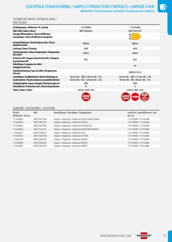 LEUCHTEN & STRAHLER MOBIL/LAMPES ET PROJECTEURS PORTABLES/LAMPADE E FARIAkkubetrieb/ Fonctionnement sur batterie/ Funzionamento a batteriaTECHNISCHE DATEN / TECHNICAL DATA / DATI TECNICIArtikelnummer/ R%u00e9f%u00e9rence / N%u00b0 articolo 1173140400 1173142600EAN/ EAN/ Codice a Barre 4007123676613 4007123677672Energieeffizienzklasse / Classe d%u2019efficience %u00e9nerg%u00e9tique / Classe di efficienza energetica -Gesamtlichtstrom/ Total luminous flux/ Flusso luminoso totale 4500 lm 6200 lmLeistung / Power/ Potenza 40 W 60 WFarbtemperatur/ Colour temperature / Temperatura del colore 6500 K 6500 KSchutzart (IP)/ Degree of protection (IP)/ Categoria di protezione (IP) IP65 IP65Kabell%u00e4nge / Longueur de c%u00e2ble / Lunghezza del cavo - 5mKabelbezeichnung / Type de c%u00e2ble / Designazione del cavo - H05RN-F 2X1,0Leuchtdauer im Akkubetrieb / Dur%u00e9e d%u2018%u00e9clairage en mode batterie / Durata luminosa in modalit%u00e0 batteria 30 min/1Ah - 100% / 40 min/1Ah - 75% 60 min/1Ah - 50% / 120 min/1Ah - 25%20 min/1Ah - 100% / 27 min/1Ah - 75% 40 min/1Ah - 50% / 80 min/1Ah - 25%Schlagfestigkeit/ Impact strength/ Resistenza agli urti IK08 IK08Schutzklasse / Protection class/ Classe di protezione III IIFarbe / Colour/ Colore schwarz/ black/ nero schwarz/ black/ nero4500LUMEN6200LUMEN CH/T13IP55ZUBEH%u00d6R / ACCESSOIRES/ ACCESSORIArt.Nr./R%u00e9f%u00e9rence / Art.no.EAN Bezeichnung / description / Designazione zu Art.Nr./ pour R%u00e9f%u00e9rence / per Art. no.1172640063 4007123677948 Adapter / Adaptateur / Adattatore BOSCH PROFESSIONAL 1173140400 / 11731426001172640064 4007123677979 Adapter / Adaptateur / Adattatore MAKITA 1173140400 / 11731426001172640065 4007123677986 Adapter / Adaptateur / Adattatore METABO CAS 1173140400 / 11731426001172640066 4007123676071 Adapter / Adaptateur / Adattatore MILWAUKEE/DEWALT 1173140400 / 11731426001172640072 4007123681853 Adapter / Adaptateur / Adattatore FLEX 1173140400 / 11731426001172640073 4007123681860 Adapter / Adaptateur / Adattatore FESTOOL 1173140400 / 11731426001172640078 4007123685349 Adapter / Adaptateur / Adattatore EINHELL 1173140400 / 11731426001172640080 4007123685363 Adapter / Adaptateur / Adattatore W%u00dcRTH 1173140400 / 11731426001172640081 4007123685370 Adapter / Adaptateur / Adattatore HIKOKI 1173140400 / 1173142600WWW.BRENNENSTUHL.COM 17