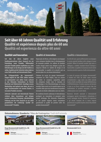 Seit %u00fcber 60 Jahren Qualit%u00e4t und ErfahrungQualit%u00e9 et exp%u00e9rience depuis plus de 60 ansQualit%u00e0 ed esperienza da oltre 60 anniSeit %u00fcber 60 Jahren begleitet unser Familienunternehmen dieser Anspruch bei der Entwicklung neuer Produkte. Millionenfach verkaufte Produkte j%u00e4hrlich verpflichten uns, hohe Anforderungen an das Design und die Funktion zu stellen. Qualit%u00e4t und die Sicherheit stehen dabei an erster Stelle und dies auf internationaler Ebene.Die Erfolgsgeschichte der brennenstuhl%u00ae-Gruppe beginnt im Jahr 1958. Seither wachsen wir kontinuierlich und z%u00e4hlen heute weltweit zu den f%u00fchrenden Unternehmen im Bereich Elektronik und Elektrotechnik. Grundlage unseres Markterfolgs sind laufend neue Ideen, die wir in enger Zusammenarbeit mit unseren Kunden, in innovative Produkte umsetzen.Zahlreiche nationale und internationale Patente sch%u00fctzen diese Innovationen und belegen unseren technischen Vorsprung. Jahrzehntelange Erfahrung und der hohe Anspruch an uns selbst gew%u00e4hrleisten die erstklassige Qualit%u00e4t der brennenstuhl%u00ae-Produkte.Qualit%u00e4t und InnovationDepuis plus de 60 ans, cette exigence accompagne notre entreprise familiale dans le d%u00e9veloppement de nouveaux produits. Les millions de produits vendus chaque ann%u00e9e nous obligent %u00e0 poser des exigences %u00e9lev%u00e9es en mati%u00e8re de design et de fonctionnalit%u00e9. La qualit%u00e9 et la s%u00e9curit%u00e9 sont au premier plan et ce, au niveau international.L%u2018histoire du succ%u00e8s du groupe brennenstuhl%u00ae commence en 1958. Depuis, nous ne cessons de cro%u00eetre et comptons aujourd%u2018hui parmi les entreprises leaders dans le domaine de l%u2018%u00e9lectronique et de l%u2018%u00e9lectrotechnique au niveau mondial. Notre succ%u00e8s sur le march%u00e9 repose sur de nouvelles id%u00e9es que nous transformons en produits innovants en %u00e9troite collaboration avec nos clients.De nombreux brevets nationaux et internationaux prot%u00e8gent ces innovations et prouvent notre avance technique. Des d%u00e9cennies d%u2018exp%u00e9rience et une grande exigence envers nousm%u00eames garantissent la qualit%u00e9 de premier ordre des produits brennenstuhl%u00ae.Qualit%u00e9 et innovationDa oltre 60 anni, questa affermazione accompagna la nostra azienda familiare nello sviluppo di nuovi prodotti. Milioni di prodotti venduti ogni anno ci obbligano a stabilire standard elevati di design e funzionalit%u00e0. La qualit%u00e0 e la sicurezza sono le nostre massime priorit%u00e0 e questo a livello internazionale.La storia di successo del Gruppo brennenstuhl%u00ae %u00e8 iniziata nel 1958. Da allora siamo cresciuti costantemente e oggi siamo una delle aziende leader a livello mondiale nel campo dell%u2018elettronica e dell%u2018elettrotecnica. Il nostro successo sul mercato si basa su un flusso costante di nuove idee che trasformiamo in prodotti innovativi in stretta collaborazione con i nostri clienti.Numerosi brevetti nazionali e internazionali proteggono queste innovazioni e dimostrano il nostro vantaggio tecnico. Decenni di esperienza e gli elevati standard che ci siamo imposti garantiscono la qualit%u00e0 di prima classe dei prodotti brennenstuhl%u00ae.Qualit%u00e0 e innovazioneUnternehmens-Standorte / Sites de l%u2018entreprise / Sedi dell%u2018aziendaHugo Brennenstuhl GmbH & Co. KGStammsitz / Si%u00e8ge social /Sede centraleT%u00fcbingen Deutschland / Allemagne / Germania)Hugo Brennenstuhl GmbH & Co. KGWerk 2 / Usine 2 / Impianto 2T%u00fcbingen Deutschland / Allemagne / Germania)Brennenstuhl S.A.S.BernolsheimFrankreich / France / Francia