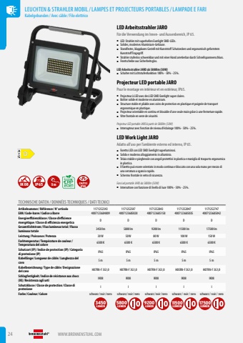 LEUCHTEN & STRAHLER MOBIL/LAMPES ET PROJECTEURS PORTABLES/LAMPADE E FARIKabelgebunden / Avec c%u00e2ble/ Filo elettrico24 WWW.BRENNENSTUHL.COMLED Arbeitsstrahler JAROF%u00fcr die Verwendung im Innen- und Aussenbereich, IP 65.%u25a0 LED-Strahler mit superhellen Everlight SMD-LEDs.%u25a0 Solides, modernes Aluminium-Geh%u00e4use.%u25a0 Standfestes, klappbares Gestell mit Kunststoff Schutzecken und ergonomisch geformtem Kunststoff Tragegriff.%u25a0 Strahler stufenlos schwenkbar und mit einer Hand arretierbar durch Schnellspannverschluss.%u25a0 Frontscheibe aus Sicherheitsglas.LED Arbeitsstrahler JARO ab 5800lm (50W)%u25a0 Schalter mit Lichtstufenfunktion 100% - 50% - 25%.Projecteur LED portable JAROPour le montage en int%u00e9rieur et en ext%u00e9rieur, IP65.%u25a0 Projecteur %u00e0 LED avec des LED SMD Everlight super claires.%u25a0 Bo%u00eetier solide et moderne en aluminium.%u25a0 Structure stable et pliable avec coins de protection en plastique et poign%u00e9e de transport ergonomique en plastique.%u25a0 Projecteur orientable en continu et blocable d%u2019une seule main gr%u00e2ce %u00e0 une fermeture rapide.%u25a0 Vitre frontale en verre de s%u00e9curit%u00e9.Projecteur LED portable JARO %u00e0 partir de 5800lm (50W)%u25a0 Interrupteur avec fonction de niveau d%u2019%u00e9clairage 100% - 50% - 25%.LED Work Light JAROAdatto all%u2019uso per l%u2019ambiente esterno ed interno, IP 65.%u25a0 Faretto LED con LED SMD Everlight superluminosi.%u25a0 Solido e moderno alloggiamento in alluminio.%u25a0 Telaio stabile e pieghevole con angoli protettivi in plastica e maniglia di trasporto ergonomica in plastica.%u25a0 Il faretto pu%u00f2 essere orientato in modo continuo e bloccato con una sola mano per mezzo di una serratura a sgancio rapido.%u25a0 Schermo frontale in vetro di sicurezza.Faro Led portatile JARO da 5800lm (50W)%u25a0 Interruttore con funzione di livello di luce 100% - 50% - 25%.TECHNISCHE DATEN / DONN%u00c9ES TECHNIQUES / DATI TECNICIArtikelnummer/ R%u00e9f%u00e9rence / N%u00b0 articolo 1171252343 1171252547 1171252843 1171252047 1171252747EAN/ Code-barre / Codice a Barre 4007123684809 4007123685028 4007123685158 4007123685035 4007123685042Energieeffizienzklasse / Classe d%u2019efficience %u00e9nerg%u00e9tique / Classe di efficienza energetica D D D D DGesamtlichtstrom/ Flux lumineux total/ Flusso luminoso totale 3450 lm 5800 lm 9200 lm 11500 lm 17500 lmLeistung / Puissance / Potenza 30 W 50 W 80 W 100 W 150 WFarbtemperatur/ Temp%u00e9rature de couleur/ Temperatura del colore 6500 K 6500 K 6500 K 6500 K 6500 KSchutzart (IP)/ Indice de protection (IP)/ Categoria di protezione (IP) IP65 IP65 IP65 IP65 IP65Kabell%u00e4nge / Longueur de c%u00e2ble / Lunghezza del cavo5 m 5 m 5 m 5 m 5 mKabelbezeichnung / Type de c%u00e2ble / Designazione del cavo H07RN-F 3G1,0 H07RN-F 3G1,0 H07RN-F 3G1,0 H05RN-F 3G1,0 H07RN-F 3G1,0Schlagfestigkeit/ Indice de r%u00e9sistance aux chocs (IK)/ Resistenza agli urti IK08 IK08 IK08 IK08 IK08Schutzklasse / Classe de protection / Classe di protezione I I I I IFarbe / Couleur/ Colore schwarz/ noir/ nero schwarz/ noir/ nero schwarz/ noir/ nero schwarz/ noir/ nero schwarz/ noir/ nero3450LUMEN5800LUMEN9200LUMEN11500LUMEN17500LUMENIK08 IP65 5m CH/T13IP55