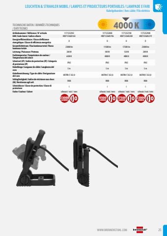 LEUCHTEN & STRAHLER MOBIL/LAMPES ET PROJECTEURS PORTABLES/LAMPADE E FARIKabelgebunden / Avec c%u00e2ble/ Filo elettricoWWW.BRENNENSTUHL.COM 25TECHNISCHE DATEN / DONN%u00c9ES TECHNIQUES / DATI TECNICI 4000KArtikelnummer/ R%u00e9f%u00e9rence / N%u00b0 articolo 1171252943 1171252040 1171252740 1171252940EAN/ Code-barre / Codice a Barre 4007123685165 4007123685196 4007123685202 4007123685219Energieeffizienzklasse / Classe d%u2019efficience %u00e9nerg%u00e9tique / Classe di efficienza energetica D D D DGesamtlichtstrom/ Flux lumineux total/ Flusso luminoso totale 23000 lm 11500 lm 17500 lm 23000 lmLeistung / Puissance / Potenza 200 W 100 W 150 W 200 WFarbtemperatur/ Temp%u00e9rature de couleur/ Temperatura del colore 6500 K 4000 K 4000 K 4000 KSchutzart (IP)/ Indice de protection (IP)/ Categoria di protezione (IP) IP65 IP65 IP65 IP65Kabell%u00e4nge / Longueur de c%u00e2ble / Lunghezza del cavo5 m 5 m 5 m 5 mKabelbezeichnung / Type de c%u00e2ble / Designazione del cavo H07RN-F 3G1,0 H07RN-F 3G1,0 H07RN-F 3G1,0 H07RN-F 3G1,0Schlagfestigkeit/ Indice de r%u00e9sistance aux chocs (IK)/ Resistenza agli urti IK08 IK08 IK08 IK08Schutzklasse / Classe de protection / Classe di protezione I I I IFarbe / Couleur/ Colore schwarz/ noir/ nero schwarz/ noir/ nero schwarz/ noir/ nero schwarz/ noir/ nero23000LUMEN11500LUMEN17500LUMEN23000LUMEN