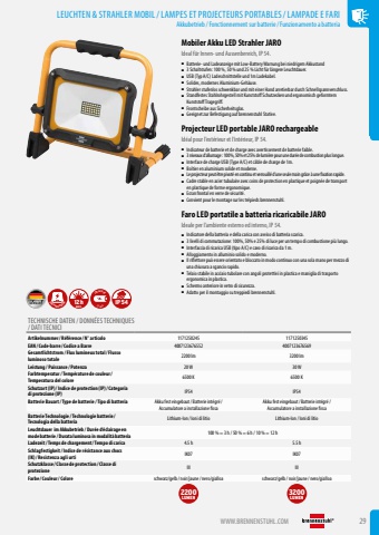LEUCHTEN & STRAHLER MOBIL/LAMPES ET PROJECTEURS PORTABLES/LAMPADE E FARIAkkubetrieb/ Fonctionnement sur batterie/ Funzionamento a batteriaWWW.BRENNENSTUHL.COM 29Mobiler Akku LED Strahler JAROIdeal f%u00fcr Innen- und Aussenbereich, IP 54.%u25a0 Batterie- und Ladeanzeige mit Low-Battery Warnung bei niedrigem Akkustand%u25a0 3 Schaltstufen: 100 %, 50 % und 25 % Licht f%u00fcr l%u00e4ngere Leuchtdauer.%u25a0 USB (Typ A/C) Ladeschnittstelle und 1m Ladekabel. %u25a0 Solides, modernes Aluminium-Geh%u00e4use.%u25a0 Strahler stufenlos schwenkbar und mit einer Hand arretierbar durch Schnellspannverschluss.%u25a0 Standfestes Stahlrohrgestell mit Kunststoff Schutzecken und ergonomisch geformtem Kunststoff Tragegriff.%u25a0 Frontscheibe aus Sicherheitsglas.%u25a0 Geeignet zur Befestigung auf brennenstuhl Stative.Projecteur LED portable JARO rechargeableId%u00e9al pour l%u2019ext%u00e9rieur et l%u2019int%u00e9rieur, IP 54.%u25a0 Indicateur de batterie et de charge avec avertissement de batterie faible.%u25a0 3 niveaux d%u2019allumage : 100%, 50% et 25% de lumi%u00e8re pour une dur%u00e9e de combustion plus longue.%u25a0 Interface de charge USB (Type A/C) et c%u00e2ble de charge de 1m. %u25a0 Bo%u00eetier en aluminium solide et moderne.%u25a0 Le projecteur peut %u00eatre pivot%u00e9 en continu et verrouill%u00e9 d%u2019une seule main gr%u00e2ce %u00e0 une fixation rapide.%u25a0 Cadre stable en acier tubulaire avec coins de protection en plastique et poign%u00e9e de transport en plastique de forme ergonomique.%u25a0 Ecran frontal en verre de s%u00e9curit%u00e9.%u25a0 Convient pour le montage sur les tr%u00e9pieds brennenstuhl.Faro LED portatile a batteria ricaricabile JAROIdeale per l%u2019ambiente esterno ed interno, IP 54.%u25a0 Indicatore della batteria e della carica con avviso di batteria scarica.%u25a0 3 livelli di commutazione: 100%, 50% e 25% di luce per un tempo di combustione pi%u00f9 lungo.%u25a0 Interfaccia di ricarica USB (tipo A/C) e cavo di ricarica da 1 m. %u25a0 Alloggiamento in alluminio solido e moderno.%u25a0 Il riflettore pu%u00f2 essere orientato e bloccato in modo continuo con una sola mano per mezzo di una chiusura a sgancio rapido.%u25a0 Telaio stabile in acciaio tubolare con angoli protettivi in plastica e maniglia di trasporto ergonomica in plastica.%u25a0 Schermo anteriore in vetro di sicurezza.%u25a0 Adatto per il montaggio su treppiedi brennenstuhl.USB POWERBANKMAX.12h Li-IonINCLUSIVE IP54TECHNISCHE DATEN / DONN%u00c9ES TECHNIQUES / DATI TECNICIArtikelnummer/ R%u00e9f%u00e9rence / N%u00b0 articolo 1171250245 1171250345EAN/ Code-barre / Codice a Barre 4007123676552 4007123676569Gesamtlichtstrom/ Flux lumineux total/ Flusso luminoso totale 2200 lm 3200 lmLeistung / Puissance / Potenza 20 W 30 WFarbtemperatur/ Temp%u00e9rature de couleur/ Temperatura del colore 6500 K 6500 KSchutzart (IP)/ Indice de protection (IP)/ Categoria di protezione (IP) IP54 IP54Batterie Bauart/ Type de batterie / Tipo di batteria Akku fest eingebaut/ Batterie int%u00e9gr%u00e9/ Accumulatore a installazione fissaAkku fest eingebaut/ Batterie int%u00e9gr%u00e9/ Accumulatore a installazione fissaBatterie Technologie / Technologie batterie / Tecnologia della batteria Lithium-Ion / Ioni di litio Lithium-Ion / Ioni di litioLeuchtdauer im Akkubetrieb / Dur%u00e9e d%u2018%u00e9clairage en mode batterie / Durata luminosa in modalit%u00e0 batteria 100 % = 3 h / 50 % = 6 h / 10 % = 12 hLadezeit/ Temps de chargement/ Tempo di carica 4.5 h 5.5 hSchlagfestigkeit/ Indice de r%u00e9sistance aux chocs (IK)/ Resistenza agli urti IK07 IK07Schutzklasse / Classe de protection / Classe di protezione III IIIFarbe / Couleur/ Colore schwarz/gelb/ noir/jaune/ nero/gialloa schwarz/gelb/ noir/jaune/ nero/gialloa2200LUMEN3200LUMEN