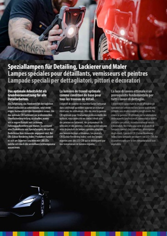 Das optimale Arbeitslicht als Grundvoraussetzung f%u00fcr alle Detailarbeiten.Die Zielsetzung, das Handwerk bei der t%u00e4glichen Arbeit verl%u00e4sslich zu unterst%u00fctzen, setzt einen engen Austausch mit den Anwendern voraus. Um das optimale CRI Sortiment zur professionellen Oberfl%u00e4chenbeurteilung zu schaffen, waren wir in engem Kontakt mit Lackierern, Fahrzeugaufbereitern und Malern. So entstand eine Produktserie von Speziallampen, die auf die Bed%u00fcrfnisse ihrer Anwender angepasst sind. Bei CRI (Colour Rendering Index) Produkten handelt es sich um Experten-Leuchten mit COB LEDs welche sich durch die verstellbare Lichttemperatur auszeichnen. Speziallampen f%u00fcr Detailing, Lackierer und MalerLampes sp%u00e9ciales pour d%u00e9taillants, vernisseurs et peintresLampade speciali per dettagliatori, pittori e decoratoriLa luce di lavoro ottimale %u00e8 un prerequisito fondamentale per tutti i lavori di dettaglio.L%u2018obiettivo di supportare in modo affidabile gli operatori del settore nel loro lavoro quotidiano richiede uno stretto scambio con gli utenti. Per creare la gamma CRI ottimale per la valutazione delle superfici professionali, siamo stati a stretto contatto con pittori, ricondizionatori di veicoli e decoratori. Ne %u00e8 nata una serie di prodotti di lampade speciali che si adattano alle esigenze degli utenti. I prodotti CRI (Colour Rendering Index) sono lampade per esperti con LED COB che si caratterizzano per la loro temperatura di luce regolabile. La lumi%u00e8re de travail optimale comme condition de base pour tous les travaux de d%u00e9tail.L%u2018objectif de soutenir de mani%u00e8re fiable l%u2018artisanat dans son travail quotidien suppose un %u00e9change %u00e9troit avec les utilisateurs. Afin de cr%u00e9er la gamme CRI optimale pour l%u2018%u00e9valuation professionnelle des surfaces, nous avons %u00e9t%u00e9 en contact %u00e9troit avec des peintres en b%u00e2timent, des pr%u00e9parateurs de v%u00e9hicules et des peintres. C%u2018est ainsi qu%u2018est n%u00e9e une s%u00e9rie de produits de lampes sp%u00e9ciales adapt%u00e9es aux besoins de leurs utilisateurs. Les produits CRI (Colour Rendering Index) sont des lampes expertes avec des LED COB qui se distinguent par leur temp%u00e9rature de lumi%u00e8re r%u00e9glable.