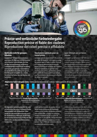 Der allgemeine Farbwiedergabeindex (Ra) wird als Durchschnitt der ersten 8 Testfarben (Prim%u00e4re Referenzfarben) nach DIN berechnet. Dabei werden die sekund%u00e4ren Referenzfarben nicht in die CRI-Berechnung einbezogen, obwohl diese f%u00fcr die korrekte Farbanpassung wichtig sind. Bei CRI15 werden die sekund%u00e4ren Referenzfarben ber%u00fccksichtigt.Allgemeiner Farbwiedergabe-Index / Indice g%u00e9n%u00e9ral de rendu des couleurs / Indice generale di resa cromatica100% 98 97 94 99 97 95 98 99+99 92 988098 96 98R1 R2 R3 R4 R5 R6 R7 R8 R9 R10 R11 R12 R13 R14 R15Prim%u00e4re ReferenzfarbenCouleurs de r%u00e9f%u00e9rence primairesColori primari di riferimentoSekund%u00e4re ReferenzfarbenCouleurs de r%u00e9f%u00e9rence secondairesColori di riferimento secondariRa CRI15Optimales Licht f%u00fcr genaues Arbeiten.brennenstuhl%u00ae CRI Speziallampen besitzen einen hohen CRI-Wert von 15CRI 96 f%u00fcr pr%u00e4zise und verl%u00e4ssliche Farbwiedergabe. Der hohe CRI-Wert und die Einstellung verschiedener Lichttemperaturen erm%u00f6glicht die Darstellung individueller und optimaler Lichtverh%u00e4ltnisse f%u00fcr die Oberfl%u00e4chenbeurteilung, eine genaue Beurteilung der Farbqualit%u00e4t wie z. B. beim Abstimmen von Farben oder das Erkennen von Lackfehlern.Pr%u00e4zise und verl%u00e4ssliche FarbwiedergabeReproduction pr%u00e9cise et fiable des couleursRiproduzione dei colori precisa e affidabileLuce ottimale per un lavoro preciso.Le lampade speciali brennenstuhl%u00ae CRI hanno un elevato valore CRI di 15CRI 96 per una resa cromatica precisa e affidabile. L%u2018elevato valore CRI e l%u2018impostazione di diverse temperature della luce consentono di visualizzare le condizioni di illuminazione individuali e ottimali per la valutazione delle superfici, la valutazione accurata della qualit%u00e0 del colore, ad esempio per l%u2018abbinamento dei colori o l%u2018identificazione dei difetti della vernice.Une lumi%u00e8re optimale pour un travail pr%u00e9cis.Les lampes sp%u00e9ciales brennenstuhl%u00ae CRI poss%u00e8dent une valeur CRI %u00e9lev%u00e9e de 15CRI 96 pour un rendu des couleurs pr%u00e9cis et fiable. La valeur CRI %u00e9lev%u00e9e et le r%u00e9glage de diff%u00e9rentes temp%u00e9ratures de lumi%u00e8re permettent de repr%u00e9senter des conditions d%u2018%u00e9clairage individuelles et optimales pour l%u2018%u00e9valuation des surfaces, une %u00e9valuation pr%u00e9cise de la qualit%u00e9 des couleurs, comme par exemple pour l%u2018harmonisation des couleurs ou la d%u00e9tection des d%u00e9fauts de peinture.L%u2018indice g%u00e9n%u00e9ral de rendu des couleurs (Ra) est calcul%u00e9 comme la moyenne des 8 premi%u00e8res couleurs de test (couleurs de r%u00e9f%u00e9rence primaires) selon la norme DIN. Ce faisant, les couleurs de r%u00e9f%u00e9rence secondaires ne sont pas prises en compte dans le calcul de l%u2018IRC, bien qu%u2018elles soient importantes pour une adaptation correcte des couleurs. Pour le CRI15, les couleurs de r%u00e9f%u00e9rence secondaires sont prises en compte.L%u2018indice di resa cromatica generale (Ra) %u00e8 calcolato come media dei primi 8 colori di prova (colori primari di riferimento) secondo la norma DIN. I colori di riferimento secondari non sono inclusi nel calcolo del CRI, sebbene siano importanti per una corretta corrispondenza cromatica. Con CRI15 si tiene conto dei colori di riferimento secondari.