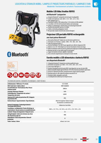 WWW.BRENNENSTUHL.COM 33LEUCHTEN & STRAHLER MOBIL/LAMPES ET PROJECTEURS PORTABLES/LAMPADE E FARIAkkubetrieb/ Fonctionnement sur batterie/ Funzionamento a batteriaMobiler LED Akku Strahler RUFUSmit Bluetooth%u00ae Lautsprecher%u25a0 Integrierte Bluetooth%u00ae Lautsprecher mit sehr guter Soundqualit%u00e4t.%u25a0 Schalter mit Funktionen: Licht: 100 % - 75 % - 50 % - 25 % - 10 %.%u25a0 USB-Ladekabel Typ A / C.%u25a0 Powerbank-Funktion: USB-Ladeanschluss 1 A f%u00fcr Ger%u00e4te mit USB Ladekabel %u25a0 Li-lon Akku 7,4 V/5 Ah mit Powerbank Funktion und Ladeanzeige.%u25a0 Geh%u00e4use aus Aludruckguss, Kantenschutz aus hochwertigem Kunststoff.%u25a0 Stossfest und sturzsicher aus bis zu 3 m H%u00f6he.%u25a0 Stabiles, mehrstufig ausklappbares Gestell.%u25a0 Mit passender robuster Tasche f%u00fcr den sicheren Transport.Projecteur LED portable RUFUS rechargeableavec haut-parleur Bluetooth%u00ae%u25a0 Haut-parleur Bluetooth%u00ae int%u00e9gr%u00e9 avec une tr%u00e8s bonne qualit%u00e9 de son.%u25a0 Interrupteur avec fonctions : Lumi%u00e8re : 100% - 75% - 50% - 25% - 10%.%u25a0 C%u00e2ble de chargement USB A / C.%u25a0 Fonction Powerbank : Port USB 1A pour appareils avec c%u00e2ble de chargement USB.%u25a0 Batterie Li-lon 7,4V / 5Ah int%u00e9gr%u00e9e avec fonction Powerbank et t%u00e9moin de charge.%u25a0 Bo%u00eetier en aluminium moul%u00e9 sous pression, protection des angles par un mat%u00e9riau plastique robuste.%u25a0 R%u00e9sistant aux chocs et aux chutes jusqu%u2019%u00e0 3m de hauteur.%u25a0 Support de maintien r%u00e9sistant, r%u00e9glable et rabattable.%u25a0 Avec un %u00e9tui de rangement pour un transport en toute s%u00e9curit%u00e9.Faretto mobile a LED alimentato a batteria RUFUScon altoparlante Bluetooth%u00ae%u25a0 %u00a0Altoparlanti bluetooth%u00ae integrati da con ottima qualit%u00e0 del suono.%u25a0 Interruttore con funzioni: uce: 100 % - 75 % - 50 % - 50 % - 25 % - 10 %.%u25a0 Cavo di carica USB Typ A / C.%u25a0 Funzione Powerbank: porta di ricarica USB 1 A per dispositivi con cavo di ricarica USB.%u25a0 Batteria ricaricabile integrata agli ioni di litio da 7,4 V/5 Ah con funzione powerbank e spia di carica.%u25a0 Involucro in alluminio pressofuso, protezione bordi e angoli in plastica pregiata.%u25a0 Resistente agli urti e alle cadute da un%u2019altezza massima di 3 m.%u25a0 Piedistallo stabile, ripiegabile a pi%u00f9 livelli.%u25a0 Con adeguata borsa robusta per un trasporto sicuro. USB POWERBANKLi-IonINCLUSIVE 3000LUMEN IK08 IP65TECHNISCHE DATEN / DONN%u00c9ES TECHNIQUES / DATI TECNICIArtikelnummer/ R%u00e9f%u00e9rence / N%u00b0 articolo 1173110200EAN/ Code-barre / Codice a Barre 4007123668458Gesamtlichtstrom/ Total luminous flux/ Flusso luminoso totale 3000 lmLeistung / Puissance / Potenza 30 WFarbtemperatur/ Temp%u00e9rature de couleur/ Temperatura del colore 6500 KSchutzart (IP)/ Indice de protection (IP)/ Categoria di protezione (IP) IP65Batterie Bauart/ Type de batterie / Tipo di batteria Akku fest eingebaut/ Batterie int%u00e9gr%u00e9/ Accumulatore a installazione fissaBatterie Technologie / Technologie batterie / Tecnologia della batteria Lithium-Ion / Ioni di litioLeuchtdauer im Akkubetrieb / Dur%u00e9e d%u2018%u00e9clairage en mode batterie / Durata luminosa in modalit%u00e0 batteria 100 % = 3 h / 75 % = 4 h / 50 % = 6 h / 25 % = 12 h / 10 % = 25 hLadezeit/ Temps de chargement/ Tempo di carica 5 hSchlagfestigkeit/ Indice de r%u00e9sistance aux chocs (IK)/ Resistenza agli urti IK08Schutzklasse / Classe de protection / Classe di protezione IIIFarbe / Couleur/ Colore schwarz/ noir/ nero